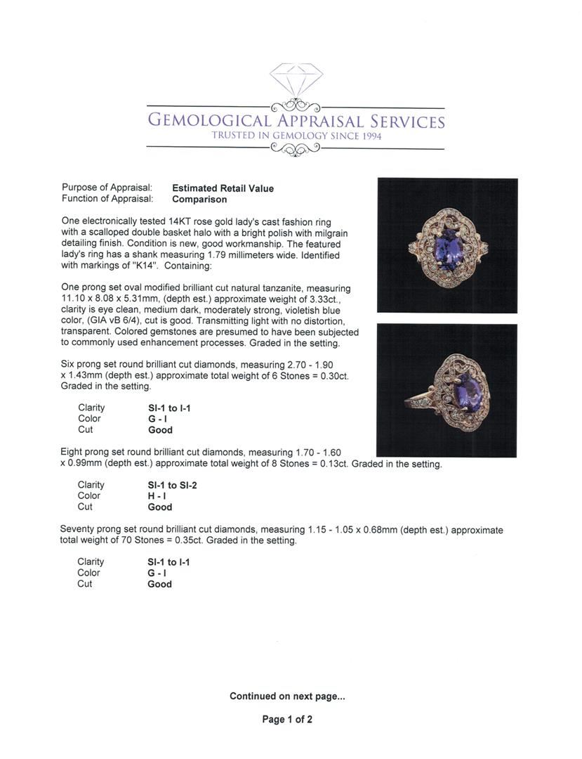 One electronically tested 14KT rose gold lady's cast fashion ring with a scalloped double basket halo with a bright polish with milgrain detailing finish. The featured lady's ring has a shank measuring 1.79 millimeters wide. Identified with markings of 'K14'. Condition is new, good workmanship. Containing: One prong set oval modified brilliant cut natural tanzanite, measuring 11.10 x 8.08 x 5.31mm, (depth est.) approximate weight of 3.33ct., clarity is eye clean, medium dark, moderately strong, violetish blue color, (GIA vB 6/4), cut is good. Transmitting light with no distortion, transparent. Colored gemstones are presumed to have been subjected to commonly used enhancement processes. Graded in the setting. Six prong set round brilliant cut diamonds, measuring 2.70 - 1.90 x 1.43mm (depth est.) approximate total weight of 6 Stones = 0.30ct. Graded in the setting. Clarity SI-1 to I-1. Color: G - I Cut Good Eight prong set round brilliant cut diamonds, measuring 1.70 - 1.60 x 0.99mm (depth est.) approximate total weight of 8 Stones = 0.13ct. Graded in the setting. Clarity SI-1 to SI-2. Color: H - I Cut Good Seventy prong set round brilliant cut diamonds, measuring 1.15 - 1.05 x 0.68mm (depth est.) approximate total weight of 70 Stones = 0.35ct. Graded in the setting. Clarity SI-1 to I-1. Color: G - I Cut Good. Total Weight of Colored Stones 3.33ct.. Total Weight of Diamonds 0.78ct.. Total Weight of Ring 7.90gm. GAS Appraised at $9,250.00.