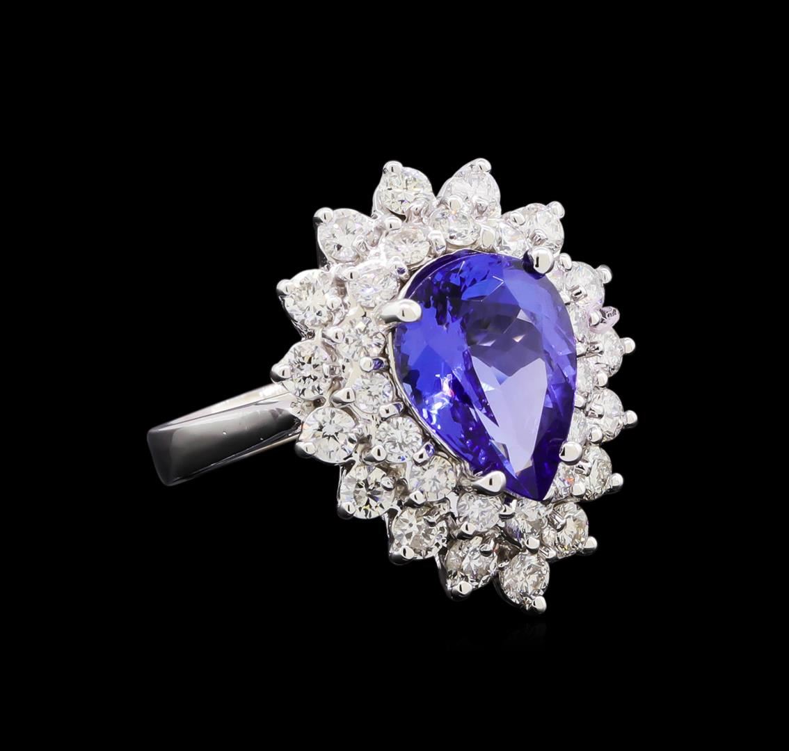 One electronically tested 14KT white gold lady's cast fashion ring with a double halo with a bright polish finish. The featured lady's ring has a shank measuring 2.77 millimeters in width. Identified with markings of "K14". Condition is new, good workmanship. Containing: One prong set pear modified brilliant cut natural tanzanite, measuring 11.42 x 8.67 x 5.40mm, (depth est.) approximate weight of 3.33ct., clarity is eye clean, medium dark, moderately strong, bluish violet color, (GIA bV 6/4), cut is very good. Transmitting light with no distortion, transparent. Colored gemstones are presumed to have been subjected to commonly used enhancement processes. Graded in the setting. Sixteen prong set round brilliant cut diamonds, measuring 2.60 - 2.50 x 1.56mm (depth est.) approximate total weight of 16 Stones = 0.92ct. Graded in the setting. Clarity: SI-1 to SI-2. Color: G - Good Fifteen prong set round brilliant cut diamonds, measuring 2.10 - 2.00 x 1.27mm (depth est.) approximate total weight of 15 Stones = 0.50ct. Graded in the setting. Clarity: SI-1 to SI-2. Color: G - Very Good. Total Weight of Colored Stones 3.33ct. Total Weight of Diamonds 1.42ct. Total Weight of Ring 7.30gm. GAS Appraised at $10,245.00.