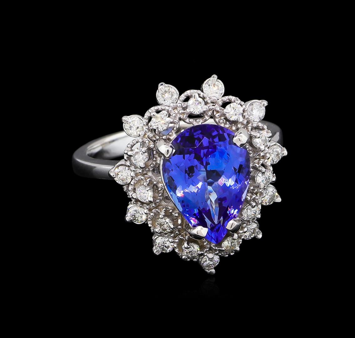 One electronically tested 14KT white gold lady's cast fashion ring with a basket double halo with a bright polish with milgrain detailing finish. The featured lady's ring has a shank measuring 2.58 millimeters wide. Identified with markings of "K14". Condition is new, good workmanship. Containing: One prong set pear modified brilliant cut natural tanzanite, measuring 11.56 x 8.25 x 5.45mm, approximate weight of 3.33ct., clarity is eye clean, type I, medium dark, moderately strong, violetish blue color, (GIA vB 6/4), cut is very good. Transmitting light with no distortion, transparent. Colored gemstones are presumed to have been subjected to commonly used enhancement processes. Graded in the setting. Eleven prong set round brilliant cut diamonds, measuring 1.90 - 1.80 x 1.15mm (depth est.) approximate total weight of 11 Stones = 0.27ct. Graded in the setting. Clarity: SI-1 to SI-2. Color: H - I. Cut Good Eleven prong set round brilliant cut diamonds, measuring 1.70 - 1.60 x 1.04mm (depth est.) approximate total weight of 11 Stones = 0.19ct. Graded in the setting. Clarity: SI-1 to SI-2. Color: H - I. Cut Good. Total Weight of Colored Stones 3.33ct. Total Weight of Diamonds 0.46ct. Total Weight of Ring 5.40gm. GAS Appraised at $7,645.00.
