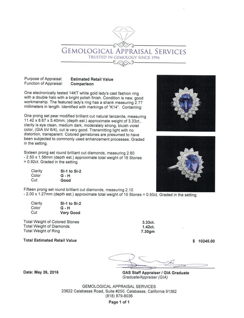 One electronically tested 14KT white gold lady's cast fashion ring with a double halo with a bright polish finish. The featured lady's ring has a shank measuring 2.77 millimeters in width. Identified with markings of "K14". Condition is new, good workmanship. Containing: One prong set pear modified brilliant cut natural tanzanite, measuring 11.42 x 8.67 x 5.40mm, (depth est.) approximate weight of 3.33ct., clarity is eye clean, medium dark, moderately strong, bluish violet color, (GIA bV 6/4), cut is very good. Transmitting light with no distortion, transparent. Colored gemstones are presumed to have been subjected to commonly used enhancement processes. Graded in the setting. Sixteen prong set round brilliant cut diamonds, measuring 2.60 - 2.50 x 1.56mm (depth est.) approximate total weight of 16 Stones = 0.92ct. Graded in the setting. Clarity: SI-1 to SI-2. Color: G - Good Fifteen prong set round brilliant cut diamonds, measuring 2.10 - 2.00 x 1.27mm (depth est.) approximate total weight of 15 Stones = 0.50ct. Graded in the setting. Clarity: SI-1 to SI-2. Color: G - Very Good. Total Weight of Colored Stones 3.33ct. Total Weight of Diamonds 1.42ct. Total Weight of Ring 7.30gm. GAS Appraised at $10,245.00.