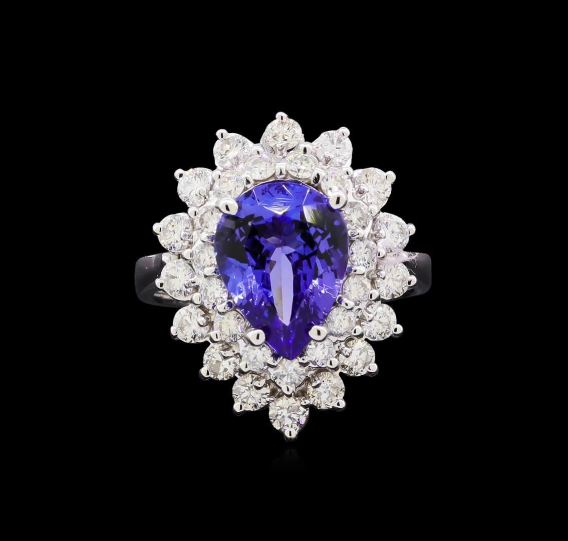 One electronically tested 14KT white gold lady's cast fashion ring with a double halo with a bright polish finish. The featured lady's ring has a shank measuring 2.77 millimeters in width. Identified with markings of "K14". Condition is new, good workmanship. Containing: One prong set pear modified brilliant cut natural tanzanite, measuring 11.42 x 8.67 x 5.40mm, (depth est.) approximate weight of 3.33ct., clarity is eye clean, medium dark, moderately strong, bluish violet color, (GIA bV 6/4), cut is very good. Transmitting light with no distortion, transparent. Colored gemstones are presumed to have been subjected to commonly used enhancement processes. Graded in the setting. Sixteen prong set round brilliant cut diamonds, measuring 2.60 - 2.50 x 1.56mm (depth est.) approximate total weight of 16 Stones = 0.92ct. Graded in the setting. Clarity: SI-1 to SI-2. Color: G - Good Fifteen prong set round brilliant cut diamonds, measuring 2.10 - 2.00 x 1.27mm (depth est.) approximate total weight of 15 Stones = 0.50ct. Graded in the setting. Clarity: SI-1 to SI-2. Color: G - Very Good. Total Weight of Colored Stones 3.33ct. Total Weight of Diamonds 1.42ct. Total Weight of Ring 7.30gm. GAS Appraised.