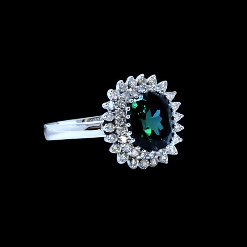 14K White GOLD NATURAL INDICO TOURMALINE RING:4.11GRAM /INDICOLITE TOURMALINE: 3.33CT/DIAMOND RD: 0.46CT/#GVR1266 **Known for its ability to aid in meditation and the expansion of consciousness, gorgeous and rare 3.33ct oval shape natural Indicolite Tourmaline casts a rarified shimmering green and blue as deep as the Arctic Sea. Crafted in 14k white gold, this precious gemstone is ensconced in an icy mist of glittering 0.46ct round cut diamonds. this ring is an investment piece and secure purchase; sending a chill of delight to behold.**