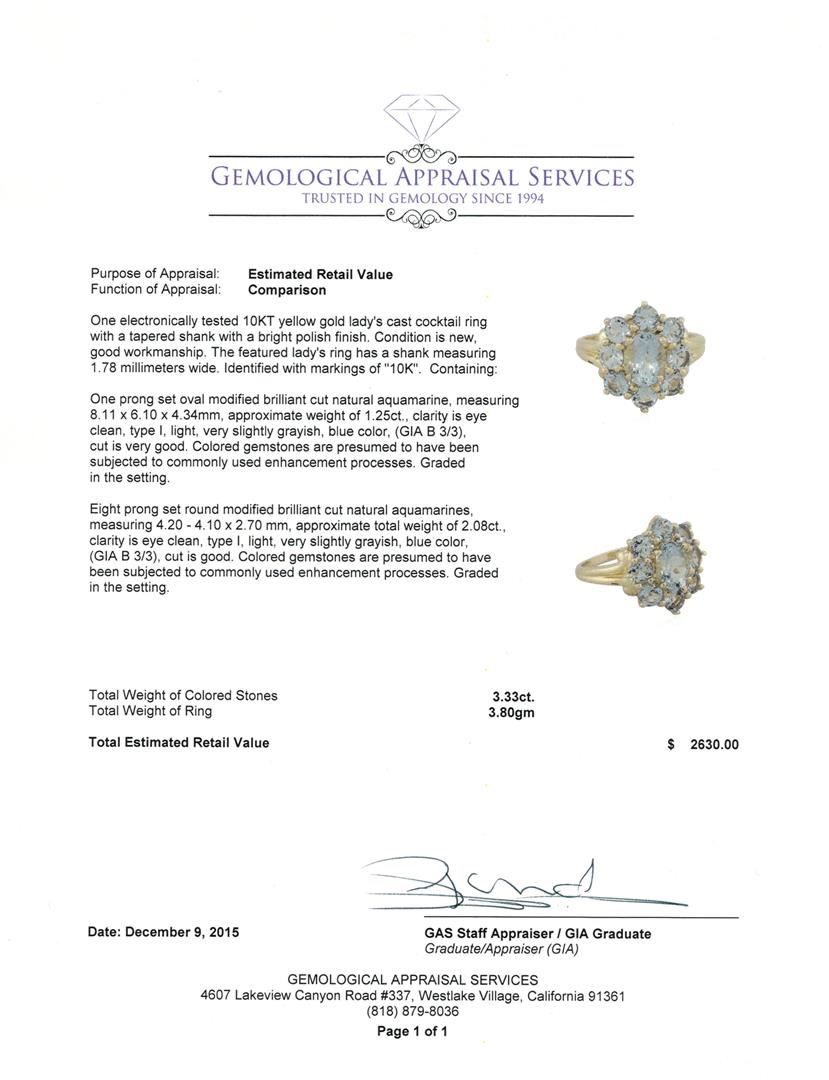 One electronically tested 10KT yellow gold lady's cast cocktail ring with a tapered shank with a bright polish finish. The featured lady's ring has a shank measuring 1.78 millimeters wide. Identified with markings of "10K". Condition is new, good workmanship. Containing: One prong set oval modified brilliant cut natural aquamarine, measuring 8.11 x 6.10 x 4.34mm, approximate weight of 1.25ct., clarity is eye clean, type I, light, very slightly grayish, blue color, (GIA B 3/3), cut is very good. Colored gemstones are presumed to have been subjected to commonly used enhancement processes. Graded in the setting. Eight prong set round modified brilliant cut natural aquamarines, measuring 4.20 - 4.10 x 2.70 mm, approximate total weight of 2.08ct., clarity is eye clean, type I, light, very slightly grayish, blue color, (GIA B 3/3), cut is good. Colored gemstones are presumed to have been subjected to commonly used enhancement processes. Graded in the setting. Total Weight of Colored Stones 3.33ct. Total Weight of Ring 3.80gm. GAS Appraised at $2,630.00.