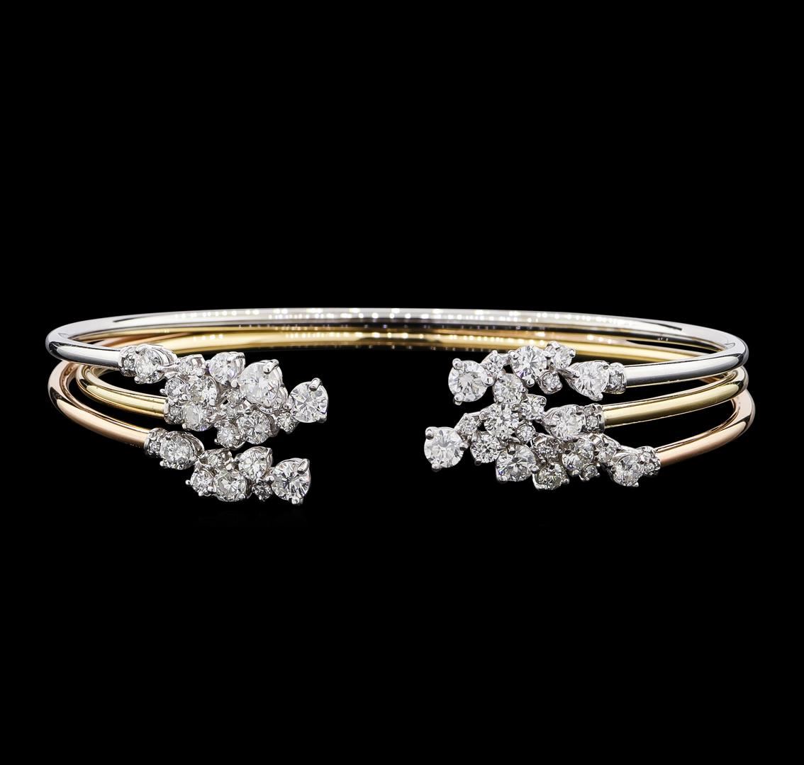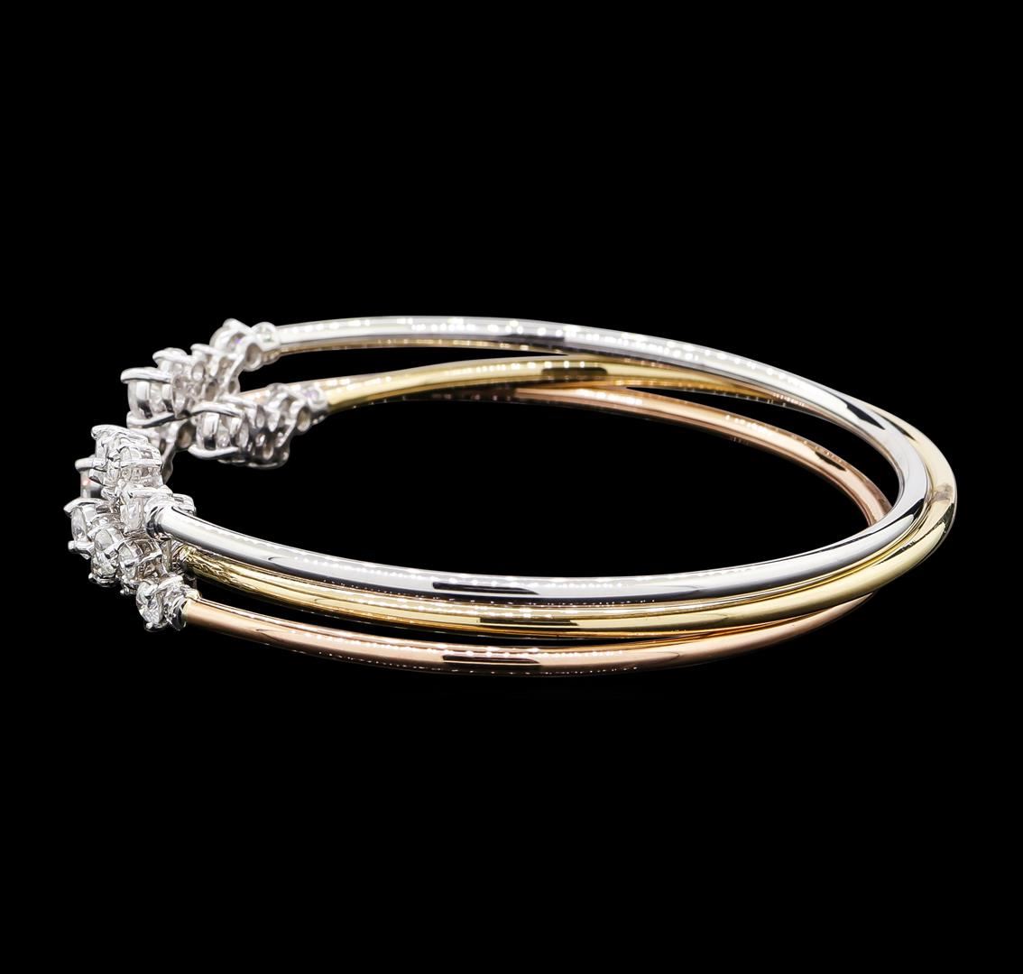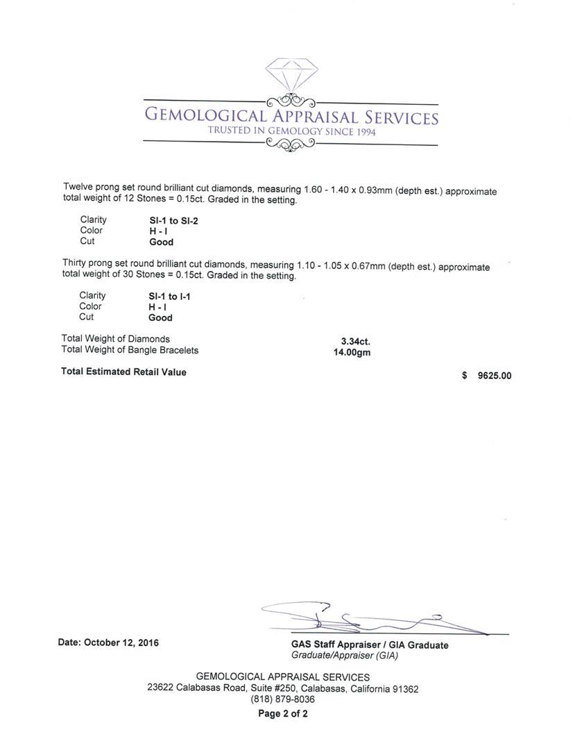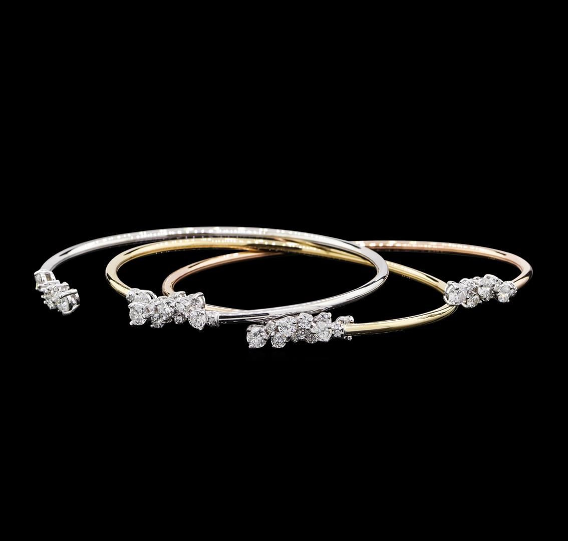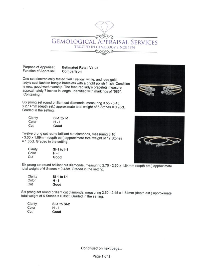 One set electronically tested 14KT yellow, white, and rose gold lady's cast fashion bangle bracelets with a bright polish finish. The featured lady's bracelets measure approximately 7 inches in length. Identified with markings of '585'. Condition is new, good workmanship. Containing: Six prong set round brilliant cut diamonds, measuring 3.55 - 3.45 x 2.14mm (depth est.) approximate total weight of 6 Stones = 0.95ct. Graded in the setting. Clarity SI-1 to I-1. Color: H - I Cut Good Twelve prong set round brilliant cut diamonds, measuring 3.10 - 3.00 x 1.89mm (depth est.) approximate total weight of 12 Stones = 1.30ct. Graded in the setting. Clarity SI-1 to I-1. Color: H - I Cut Good Six prong set round brilliant cut diamonds, measuring 2.70 - 2.60 x 1.64mm (depth est.) approximate total weight of 6 Stones = 0.43ct. Graded in the setting. Clarity SI-1 to I-1. Color: H - I Cut Good Six prong set round brilliant cut diamonds, measuring 2.50 - 2.45 x 1.54mm (depth est.) approximate total weight of 6 Stones = 0.36ct. Graded in the setting. Clarity SI-1 to SI-2. Color: H - I Cut Good Twelve prong set round brilliant cut diamonds, measuring 1.60 - 1.40 x 0.93mm (depth est.) approximate total weight of 12 Stones = 0.15ct. Graded in the setting. Clarity SI-1 to SI-2. Color: H - I Cut Good Thirty prong set round brilliant cut diamonds, measuring 1.10 - 1.05 x 0.67mm (depth est.) approximate total weight of 30 Stones = 0.15ct. Graded in the setting. Clarity SI-1 to I-1. Color: H - I Cut Good. Total Weight of Diamonds 3.34ct.. Total Weight of Bangle Bracelets 14.00gm. GAS Appraised at $9,625.00.