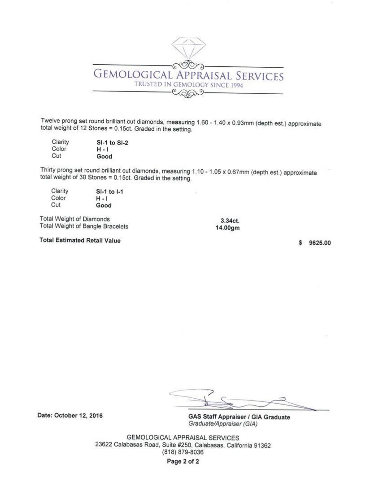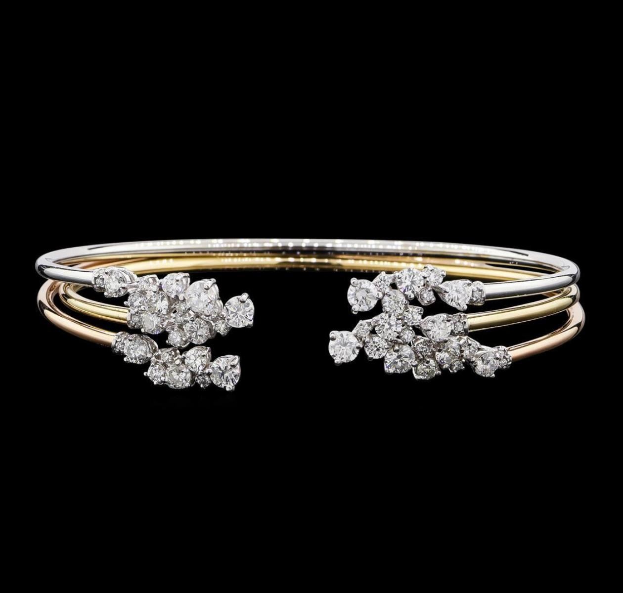 One set electronically tested 14KT yellow, white, and rose gold lady's cast fashion bangle bracelets with a bright polish finish. The featured lady's bracelets measure approximately 7 inches in length. Identified with markings of '585'. Condition is new, good workmanship. Containing: Six prong set round brilliant cut diamonds, measuring 3.55 - 3.45 x 2.14mm (depth est.) approximate total weight of 6 Stones = 0.95ct. Graded in the setting. Clarity SI-1 to I-1. Color: H - I Cut Good Twelve prong set round brilliant cut diamonds, measuring 3.10 - 3.00 x 1.89mm (depth est.) approximate total weight of 12 Stones = 1.30ct. Graded in the setting. Clarity SI-1 to I-1. Color: H - I Cut Good Six prong set round brilliant cut diamonds, measuring 2.70 - 2.60 x 1.64mm (depth est.) approximate total weight of 6 Stones = 0.43ct. Graded in the setting. Clarity SI-1 to I-1. Color: H - I Cut Good Six prong set round brilliant cut diamonds, measuring 2.50 - 2.45 x 1.54mm (depth est.) approximate total weight of 6 Stones = 0.36ct. Graded in the setting. Clarity SI-1 to SI-2. Color: H - I Cut Good Twelve prong set round brilliant cut diamonds, measuring 1.60 - 1.40 x 0.93mm (depth est.) approximate total weight of 12 Stones = 0.15ct. Graded in the setting. Clarity SI-1 to SI-2. Color: H - I Cut Good Thirty prong set round brilliant cut diamonds, measuring 1.10 - 1.05 x 0.67mm (depth est.) approximate total weight of 30 Stones = 0.15ct. Graded in the setting. Clarity SI-1 to I-1. Color: H - I Cut Good. Total Weight of Diamonds 3.34ct.. Total Weight of Bangle Bracelets 14.00gm. GAS Appraised.