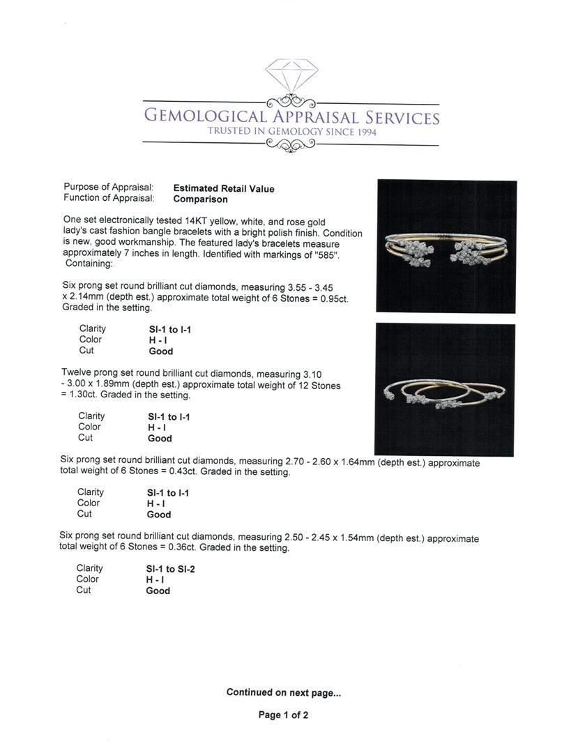 One set electronically tested 14KT yellow, white, and rose gold lady's cast fashion bangle bracelets with a bright polish finish. The featured lady's bracelets measure approximately 7 inches in length. Identified with markings of '585'. Condition is new, good workmanship. Containing: Six prong set round brilliant cut diamonds, measuring 3.55 - 3.45 x 2.14mm (depth est.) approximate total weight of 6 Stones = 0.95ct. Graded in the setting. Clarity SI-1 to I-1. Color: H - I Cut Good Twelve prong set round brilliant cut diamonds, measuring 3.10 - 3.00 x 1.89mm (depth est.) approximate total weight of 12 Stones = 1.30 ct. Graded in the setting. Clarity SI-1 to I-1. Color: H - I Cut Good Six prong set round brilliant cut diamonds, measuring 2.70 - 2.60 x 1.64mm (depth est.) approximate total weight of 6 Stones = 0.43ct. Graded in the setting. Clarity SI-1 to I-1. Color: H - I Cut Good Six prong set round brilliant cut diamonds, measuring 2.50 - 2.45 x 1.54mm (depth est.) approximate total weight of 6 Stones = 0.36ct. Graded in the setting. Clarity SI-1 to SI-2. Color: H - I Cut Good Twelve prong set round brilliant cut diamonds, measuring 1.60 - 1.40 x 0.93mm (depth est.) approximate total weight of 12 Stones = 0.15ct. Graded in the setting. Clarity SI-1 to SI-2. Color: H - I Cut Good Thirty prong set round brilliant cut diamonds, measuring 1.10 - 1.05 x 0.67mm (depth est.) approximate total weight of 30 Stones = 0.15ct. Graded in the setting. Clarity SI-1 to I-1. Color: H - I Cut Good. Total Weight of Diamonds 3.34ct.. Total Weight of Bangle Bracelets 14.00gm. GAS Appraised.