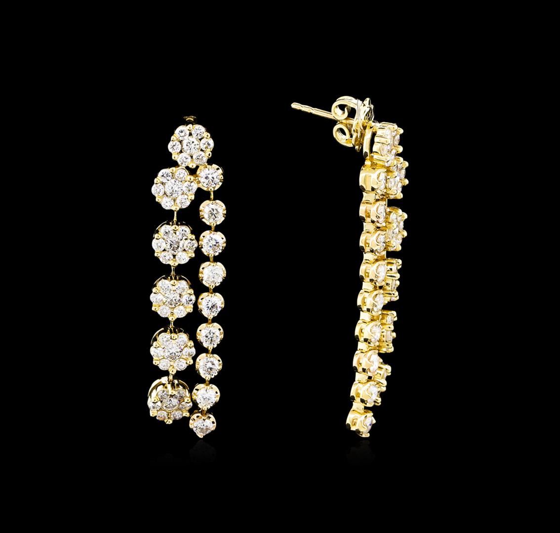 One pair electronically tested 14KT yellow gold lady's combination cast & assembled dangle earrings with friction posts with a bright polish finish. The featured pair of lady's earring have a dangle of approximately 40 millimeters. Identified with markings of "585". Condition is new, good workmanship. Containing: Eighteen prong set round brilliant cut diamonds, measuring 2.70 - 2.60 x 1.64mm (depth est.) approximate total weight of 18 Stones = 1.27ct. Graded in the setting. Clarity: SI-1 to SI-2. Color: H - I. Cut Good Seventy-Two prong set round brilliant cut diamonds, measuring 1.70 - 1.65 x 1.04mm (depth est.) approximate total weight of 72 Stones = 1.30ct. Graded in the setting. Clarity: SI-1 to SI-2. Color: H - I. Cut Good Twelve prong set round brilliant cut diamonds, measuring 2.55 - 2.50 x 1.59mm (depth est.) approximate total weight of 12 Stones = 0.77ct. Graded in the setting. Clarity: VS-2 to SI-2. Color: H - I. Cut Good. Total Weight of Diamonds 3.34ct. Total Weight of Earrings 9.70gm.
