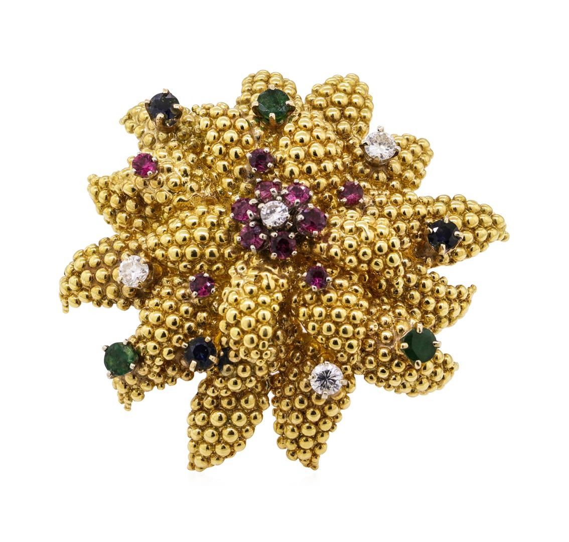 One electronically tested 22KT yellow gold lady's combination cast & assembled fashion floral design pendant-pin with a bright polish finish. The featured pendant-pin has a diameter of approximately two inches. Condition is like new, good workmanship. Containing: Three prong set round modified mixed cut natural emeralds, measuring 3.75 x 2.63 mm, (depth est.) approximate total weight of 0.60ct., clarity is heavily included, medium dark, moderately strong, green color, (GIA G 6/4), cut is good. Transmitting light somewhat diffusely, semi-transparent to translucent. Naturally occurring internal & external characteristics are present. Indications of oil residue. Colored gemstones are presumed to have been subjected to commonly used enhancement processes. Graded in the setting. Three prong set round modified mixed cut natural blue sapphires, measuring 3.50 - 3.40 x 2.24 mm, (depth est.) approximate total weight of 0.66ct., clarity is moderately included, medium dark, moderately strong, blue color, (GIA B 6/4), cut is good. Transmitting light somewhat diffusely, transparent to translucent. Colored gemstones are presumed to have been subjected to commonly used enhancement processes. Graded in the setting. Eleven prong set round modified mixed cut natural rubies, measuring 2.90 - 2.70 x 1.96 mm, (depth est.) approximate total weight of 1.43ct., clarity is slightly included, medium, moderately strong, strongly purplish red color, (GIA stpR 5/4), cut is good. Transmitting light with a minimum of distortion, transparent. Colored gemstones are presumed to have been subjected to commonly used enhancement processes. Graded in the setting. Four prong set round brilliant cut diamonds, measuring 3.70 - 3.30 x 2.17mm (depth est.) approximate total weight of 4 Stones = 0.65ct. Graded in the setting. Color G - H Clarity VS-2 to SI-2 Cut Good. Total Weight of Colored Stones 2.69ct.. Total Weight of Diamonds 0.65ct.. Total Weight of Pendant-Pin 39.90gm GAS Appraised at $8850.00. GAS Appraised.