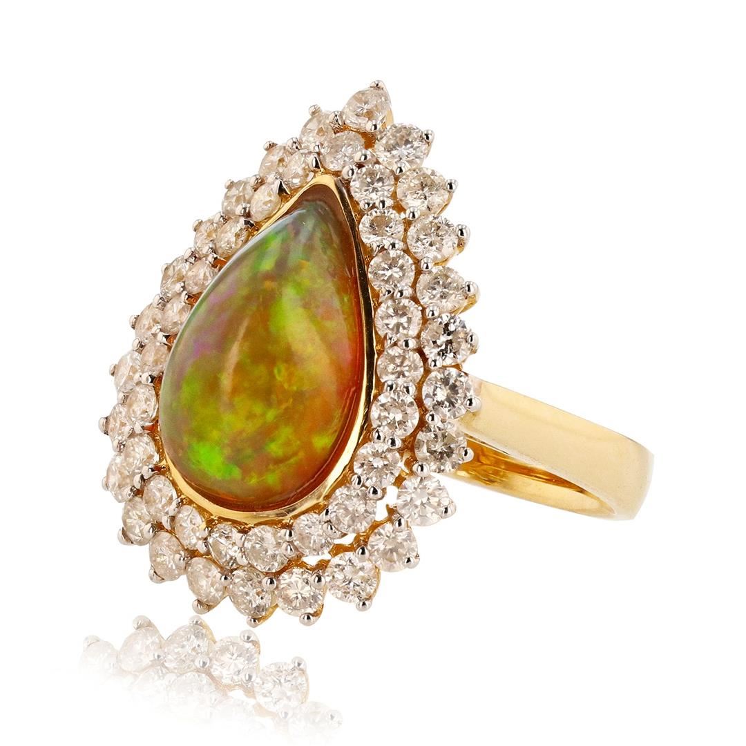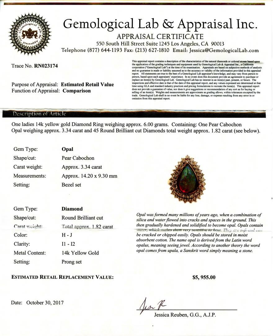One ladies 14k yellow gold Diamond Ring weighing approx. 6.00 grams. Containing: One Pear Cabochon Opal weighing approx. 3.34 carat and 45 Round Brilliant cut Diamonds total weight approx. 1.82 carat (see below). Gem Type: Opal Shape/cut: Pear Cabochon Carat weight: Approx. 3.34 carat Measurements: Approx. 14.20 x 9.30 mm Setting: Bezel set Gem Type: Diamond Shape/cut: Round Brilliant cut Carat Weight: Total approx. 1.82 carat Color: H-J Clarity: I-1 to I-2 Metal Content: 14k Yellow Gold Setting: Prong set