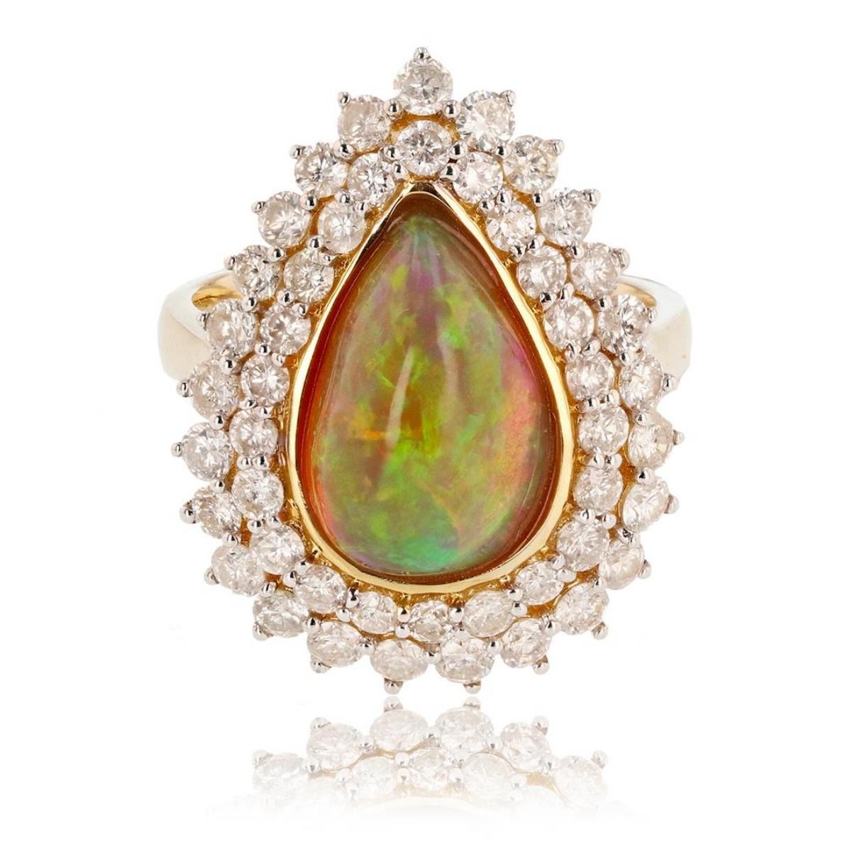 One ladies 14k yellow gold Diamond Ring weighing approx. 6.00 grams. Containing: One Pear Cabochon Opal weighing approx. 3.34 carat and 45 Round Brilliant cut Diamonds total weight approx. 1.82 carat (see below). Gem Type: Opal Shape/cut: Pear Cabochon Carat weight: Approx. 3.34 carat Measurements: Approx. 14.20 x 9.30 mm Setting: Bezel set Gem Type: Diamond Shape/cut: Round Brilliant cut Carat Weight: Total approx. 1.82 carat Color: H-J Clarity: I-1 to I-2 Metal Content: 14k Yellow Gold Setting: Prong set