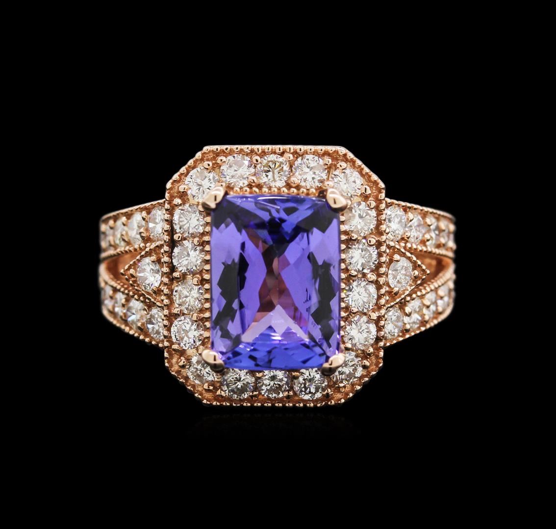 One electronically tested 14KT rose gold lady's cast fashion ring with a split shank with a bright polish with milgrain detailing finish. The featured lady's ring has a halo motif and shank measuring 4.43 millimeters wide. Identified with markings of "14K". Condition is new, good workmanship. Containing: One prong set rectangular cushion modified brilliant cut natural tanzanite, measuring 10.37 x 7.66 x 4.71mm, 10% bulge factor, approximate weight of 3.34ct., clarity is eye clean, type I, medium, very slightly grayish, violetish blue color, (GIA vB 5/3), cut is good. Transmitting light with no distortion, transparent. Colored gemstones are presumed to have been subjected to commonly used enhancement processes. Graded in the setting. Forty prong set round brilliant cut diamonds, measuring 2.10 - 2.00 x 1.33mm (depth est.) approximate total weight of 40 Stones = 1.38ct. Graded in the setting. Clarity: SI-2 to I-1. Color: H - I. Cut Good. Total Weight of Colored Stones 3.34ct. Total Weight of Diamonds 1.38ct. Total Weight of Ring 8.40gm. GAS Appraised at $9,310.00.