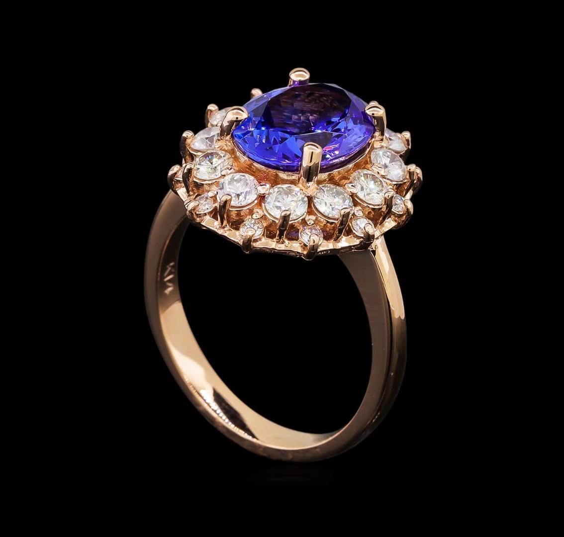 One electronically tested 14KT rose gold lady's cast fashion ring with a double basket halo with a bright polish finish. The featured lady's ring has a shank measuring 2.92 millimeters wide. Identified with markings of 'K14'. Condition is new, good workmanship. Containing: One prong set oval modified brilliant cut natural tanzanite, measuring 10.92 x 8.48 x 5.00mm, (depth est.) approximate weight of 3.34ct., clarity is eye clean, medium, moderately strong, violetish blue color, (GIA vB 5/4), cut is very good. Transmitting light with no distortion, transparent. Colored gemstones are presumed to have been subjected to commonly used enhancement processes. Graded in the setting. Twelve prong set round brilliant cut diamonds, measuring 2.90 - 2.80 x 1.71mm (depth est.) approximate total weight of 12 Stones = 1.01ct. Graded in the setting. Clarity VS-2 to SI-2. Color: H - I Cut Good Twelve prong set round brilliant cut diamonds, measuring 1.55 - 1.45 x 0.92mm (depth est.) approximate total weight of 12 Stones = 0.15ct. Graded in the setting. Clarity SI-1 to I-1. Color: H - I Cut Good. Total Weight of Colored Stones 3.34ct.. Total Weight of Diamonds 1.16ct.. Total Weight of Ring 7.00gm. GAS Appraised at $9,260.00.