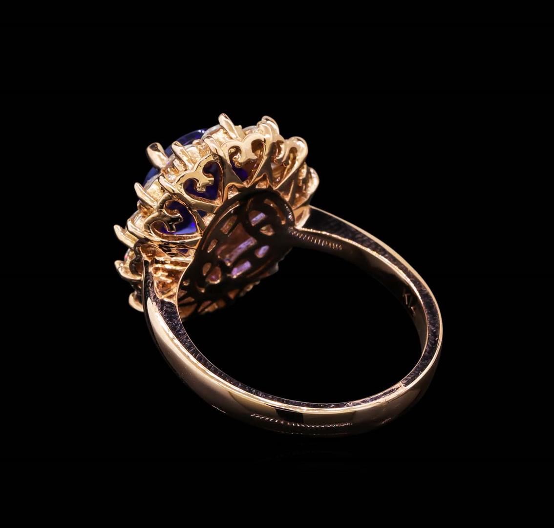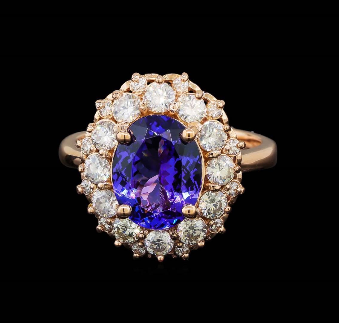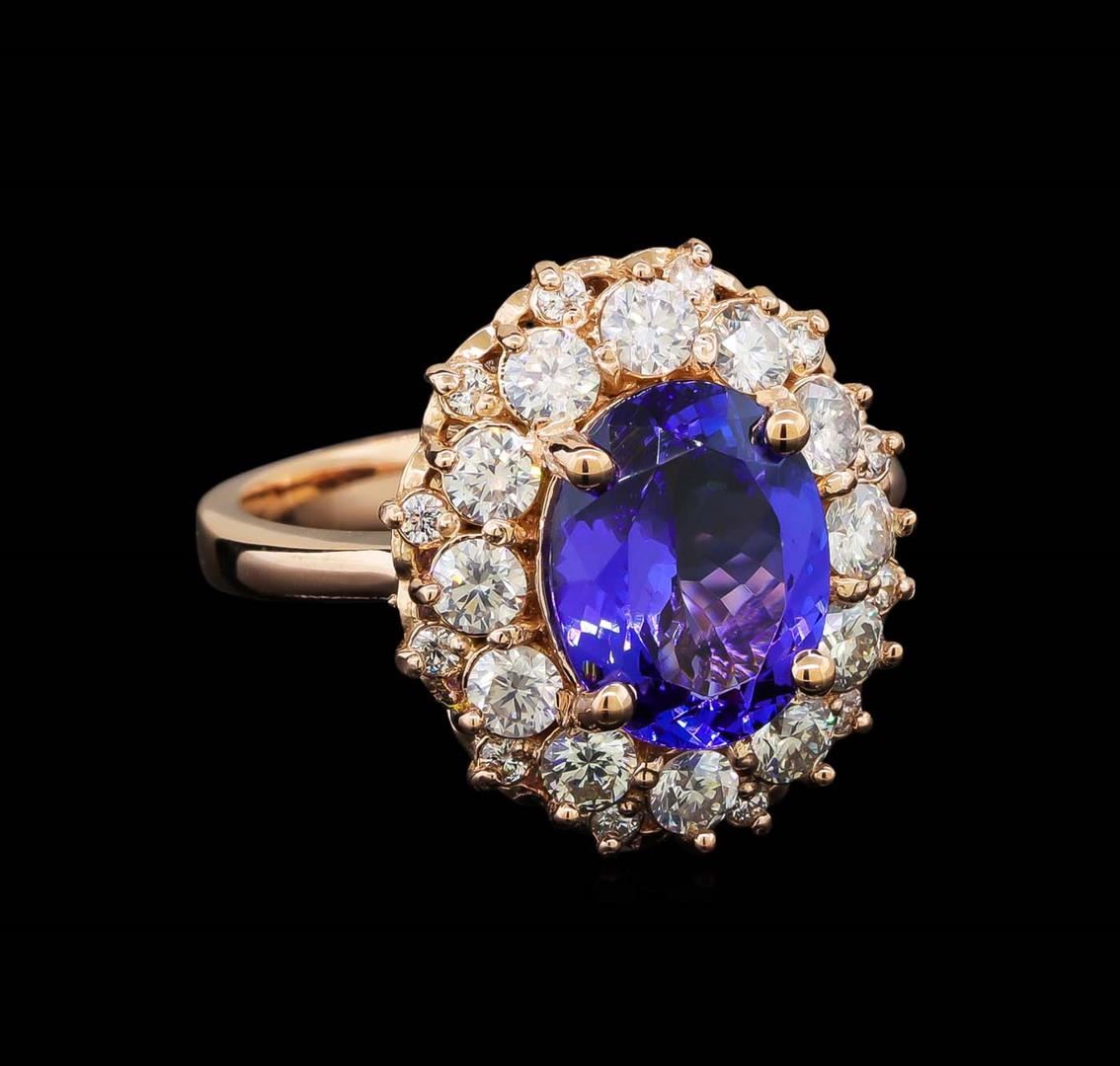 One electronically tested 14KT rose gold lady's cast fashion ring with a double basket halo with a bright polish finish. The featured lady's ring has a shank measuring 2.92 millimeters wide. Identified with markings of 'K14'. Condition is new, good workmanship. Containing: One prong set oval modified brilliant cut natural tanzanite, measuring 10.92 x 8.48 x 5.00mm, (depth est.) approximate weight of 3.34ct., clarity is eye clean, medium, moderately strong, violetish blue color, (GIA vB 5/4), cut is very good. Transmitting light with no distortion, transparent. Colored gemstones are presumed to have been subjected to commonly used enhancement processes. Graded in the setting. Twelve prong set round brilliant cut diamonds, measuring 2.90 - 2.80 x 1.71mm (depth est.) approximate total weight of 12 Stones = 1.01ct. Graded in the setting. Clarity VS-2 to SI-2. Color: H - I Cut Good Twelve prong set round brilliant cut diamonds, measuring 1.55 - 1.45 x 0.92mm (depth est.) approximate total weight of 12 Stones = 0.15ct. Graded in the setting. Clarity SI-1 to I-1. Color: H - I Cut Good. Total Weight of Colored Stones 3.34ct.. Total Weight of Diamonds 1.16ct.. Total Weight of Ring 7.00gm. GAS Appraised at $9,260.00.