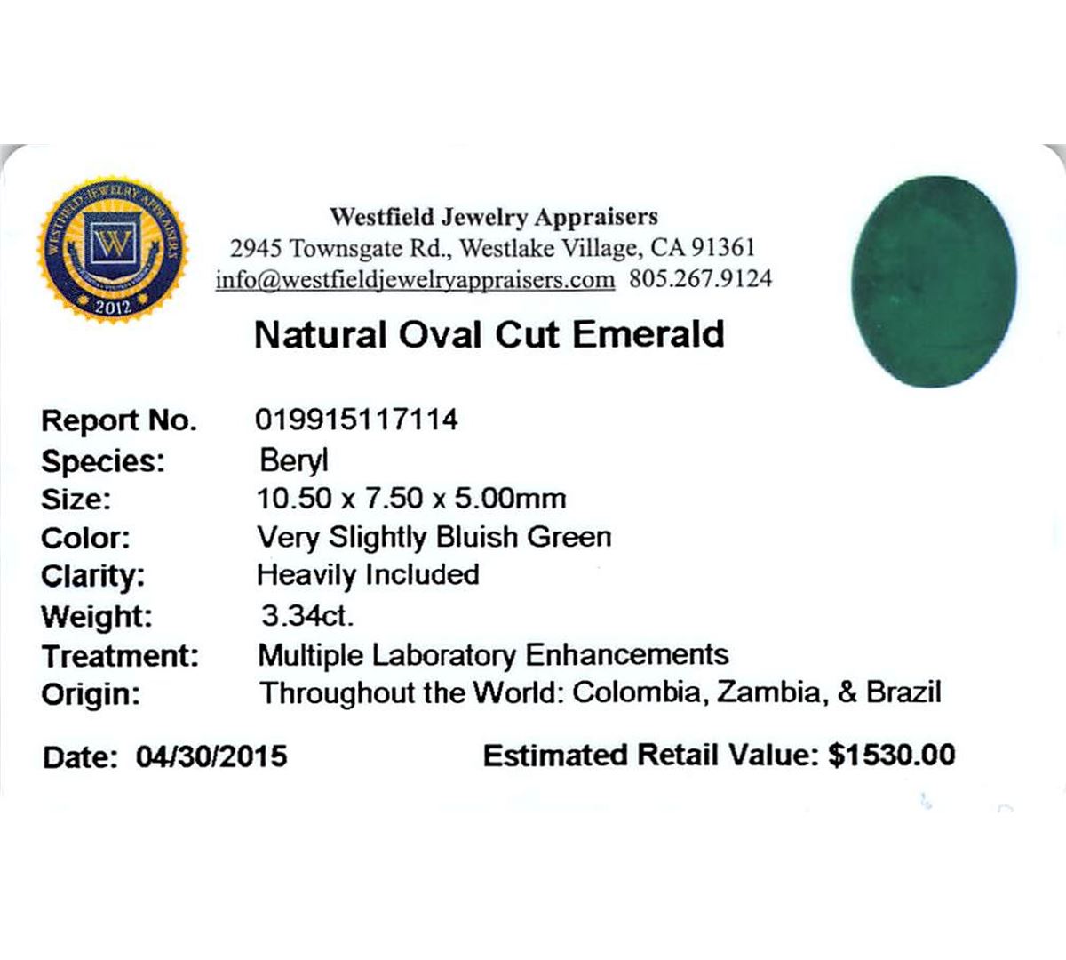 One oval mixed cut natural emerald exact weight 3.34ct., clarity is heavily included, type III, medium dark, very slightly grayish, very slightly bluish green color, (GIA vslbG 6/3), cut is good. Westfield Appraised at $1,530.00.