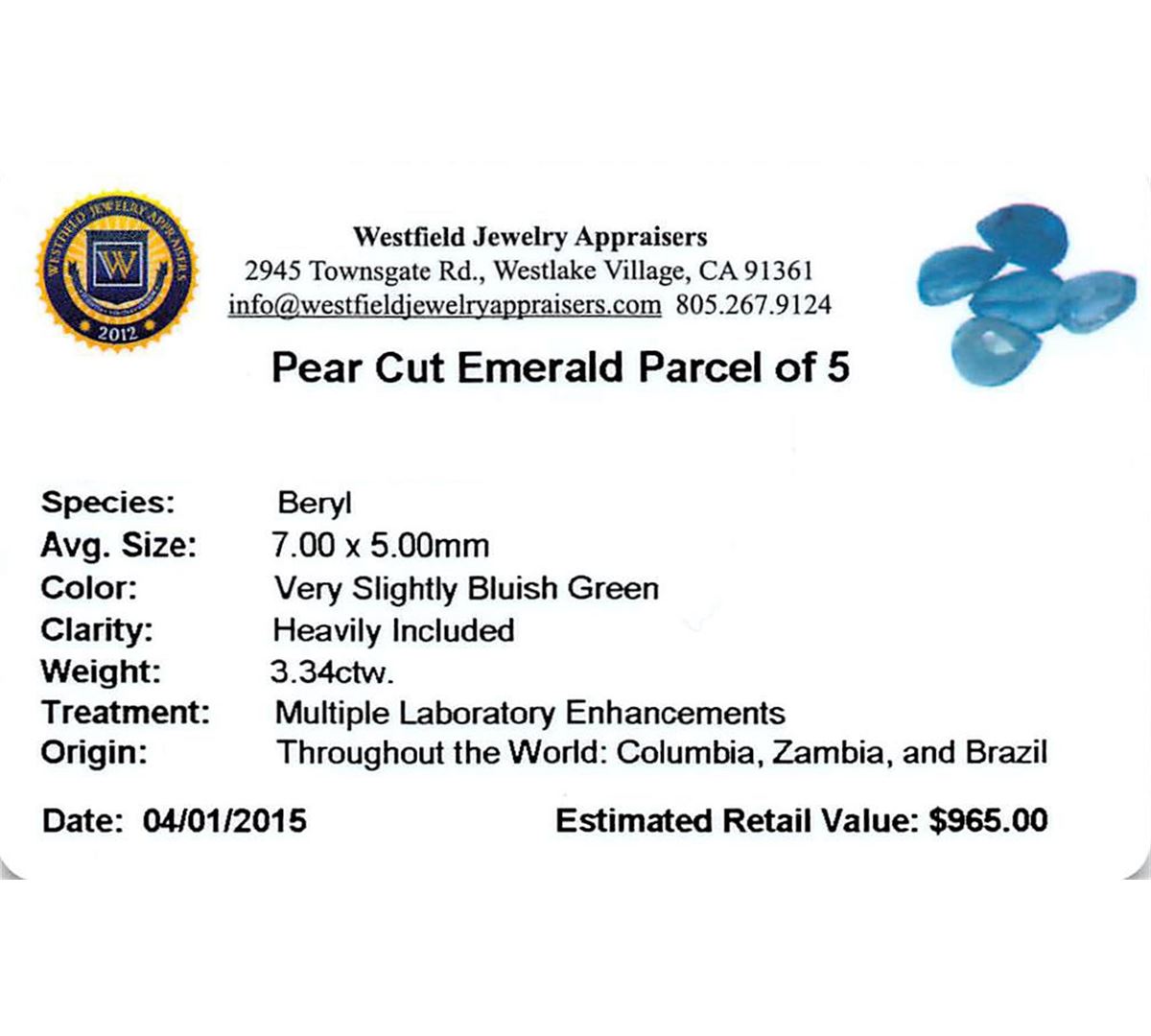 One pear cut natural emerald exact weight 3.34ct., clarity is heavily included, type III, medium, very slightly grayish, very slightly bluish green color, (GIA vslbG 5/3), cut is good. Westfield Appraised at $965.00.