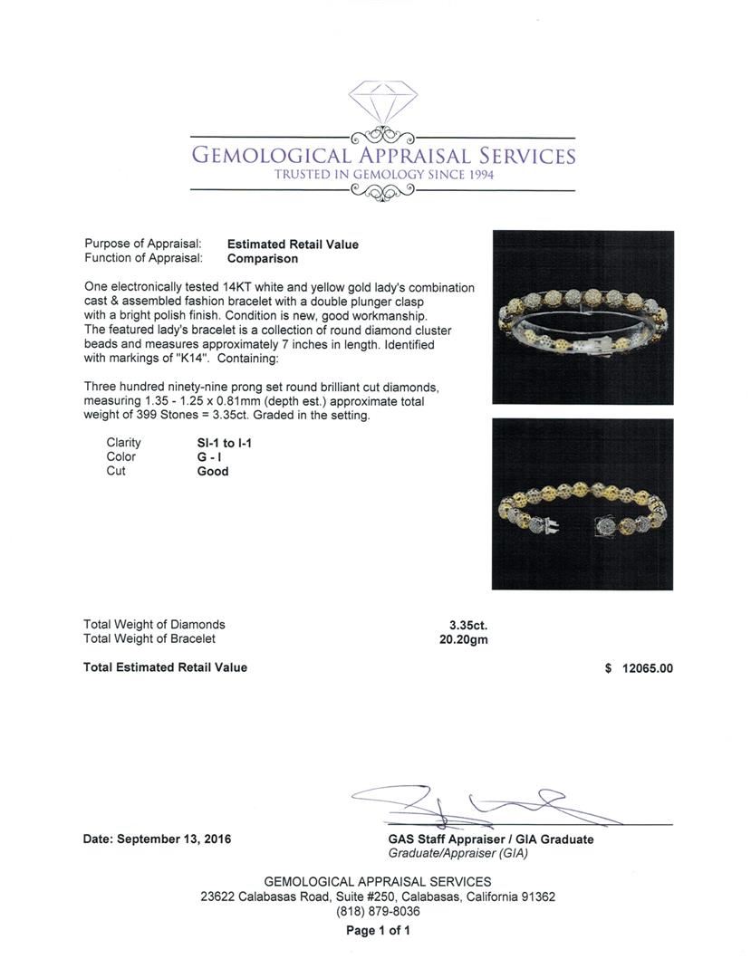 One electronically tested 14KT white and yellow gold lady's combination cast & assembled fashion bracelet with a double plunger clasp with a bright polish finish. The featured lady's bracelet is a collection of round diamond cluster beads and measures approximately 7 inches in length. Identified with markings of 'K14'. Condition is new, good workmanship. Containing: Three Hundred Ninety-Nine prong set round brilliant cut diamonds, measuring 1.35 - 1.25 x 0.81mm (depth est.) approximate total weight of 399 Stones = 3.35ct. Graded in the setting. Clarity SI-1 to I-1. Color: G - I Cut Good. Total Weight of Diamonds 3.35ct.. Total Weight of Bracelet 20.20gm GAS Appraised at $12,065.00.
