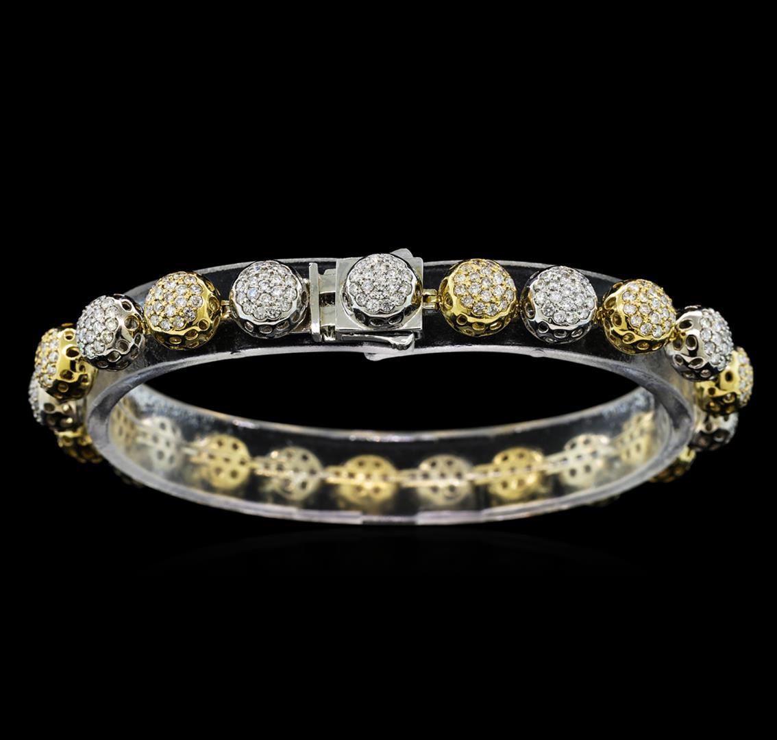 One electronically tested 14KT white and yellow gold lady's combination cast & assembled fashion bracelet with a double plunger clasp with a bright polish finish. The featured lady's bracelet is a collection of round diamond cluster beads and measures approximately 7 inches in length. Identified with markings of 'K14'. Condition is new, good workmanship. Containing: Three Hundred Ninety-Nine prong set round brilliant cut diamonds, measuring 1.35 - 1.25 x 0.81mm (depth est.) approximate total weight of 399 Stones = 3.35ct. Graded in the setting. Clarity SI-1 to I-1. Color: G - I Cut Good. Total Weight of Diamonds 3.35ct.. Total Weight of Bracelet 20.20gm GAS Appraised at $12,065.00.