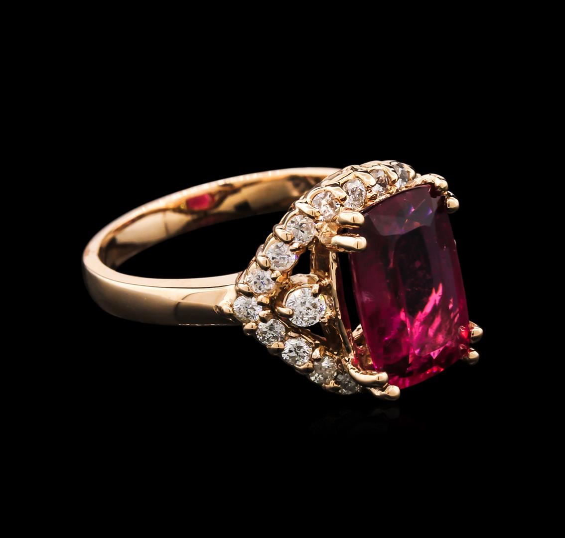 One electronically tested 14KT rose gold lady's cast fashion ring with a split shank with a bright polish finish. The featured lady's ring has a basket halo motif and a shank measuring 2.59 millimeters wide. Identified with markings of "K14". Condition is new, good workmanship. Containing: One prong set rectangular cushion modified brilliant cut natural pink tourmaline, measuring 11.55 x 7.52 x 4.57mm, 17% bulge factor, approximate weight of 3.35ct., clarity is moderately included, type II, medium, moderately strong, slightly purplish red color, (GIA slpR 5/4), cut is good. Transmitting light somewhat diffusely, transparent to translucent. Colored gemstones are presumed to have been subjected to commonly used enhancement processes. Graded in the setting. Two prong set round brilliant cut diamonds, measuring 2.40 - 2.35 x 1.48mm (depth est.) approximate total weight of 2 Stones = 0.10ct. Graded in the setting. Clarity: SI-2 to I-1. Color: H - I. Cut Good Twenty-Two prong set round brilliant cut diamonds, measuring 1.80 - 1.75 x 1.10mm (depth est.) approximate total weight of 22 Stones = 0.47ct. Graded in the setting. Clarity: SI-2 to I-1. Color: H - I. Cut Good. Total Weight of Colored Stones 3.35ct. Total Weight of Diamonds 0.57ct. Total Weight of Ring 5.70gm. GAS Appraised at $4,245.00.