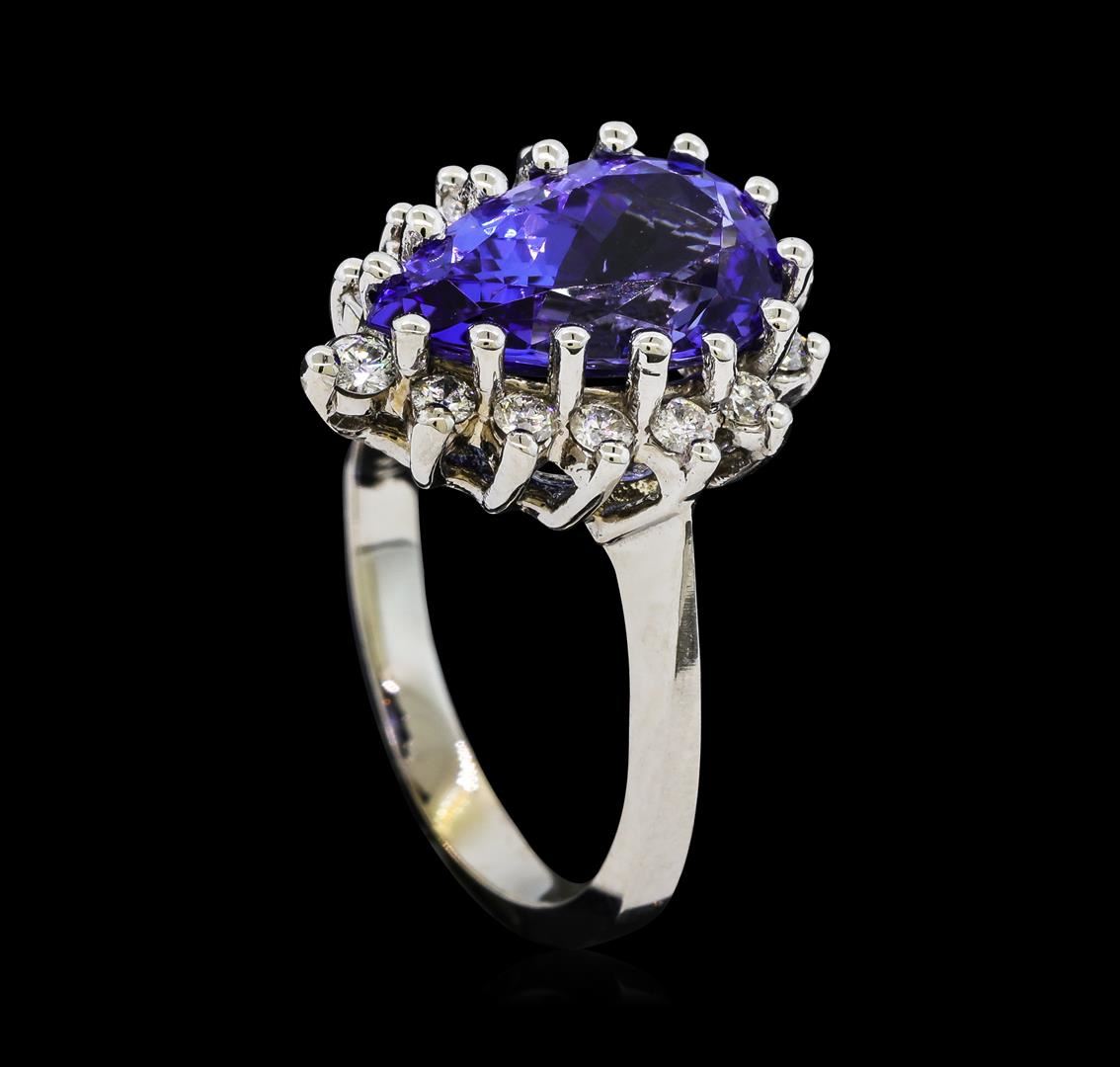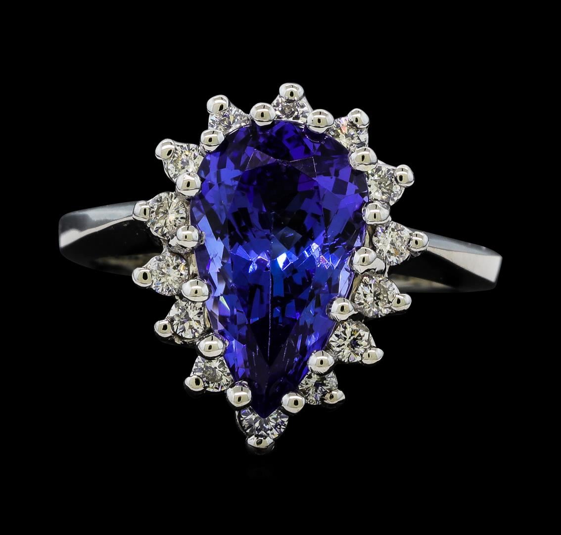 One electronically tested 14KT white gold lady's cast fashion ring with a basket halo with a bright polish finish. The featured lady's ring has a shank measuring 2.40 millimeters wide. Identified with markings of '14K'. Condition is new, good workmanship. Containing: One prong set pear modified brilliant cut natural tanzanite, measuring 13.00 x 8.10 x 5.50mm, (depth est.) approximate weight of 3.35ct., clarity is eye clean, medium dark, strong, violetish blue color, (GIA vB 6/5), cut is very good. Transmitting light with no distortion, transparent. Colored gemstones are presumed to have been subjected to commonly used enhancement processes. Graded in the setting. Fourteen prong set round brilliant cut diamonds, measuring 1.95 - 1.85 x 1.14mm (depth est.) approximate total weight of 14 Stones = 0.35ct. Graded in the setting. Clarity SI-1 to SI-2. Color: H - I Cut Good. Total Weight of Colored Stones 3.35ct.. Total Weight of Diamonds 0.35ct.. Total Weight of Ring 4.90gm. GAS Appraised at $6,305.00.