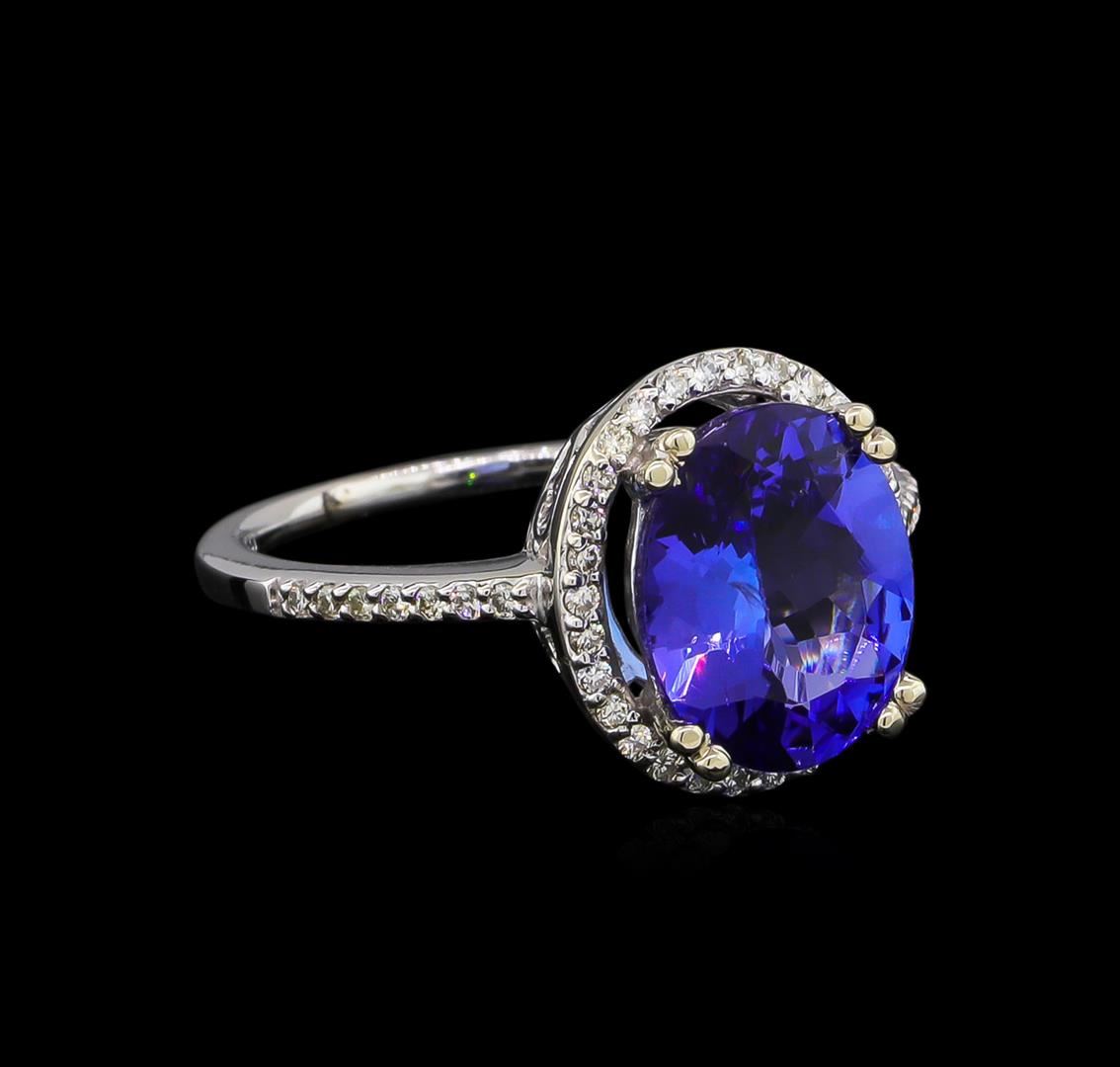 One electronically tested 14KT white gold lady's cast fashion ring with a halo with a bright polish finish. The featured lady's ring has a shank measuring 1.38 millimeters wide. Identified with markings of "14K". Condition is new, good workmanship. Containing: One prong set oval modified brilliant cut natural tanzanite, measuring 11.08 x 9.03 x 4.91mm, approximate weight of 3.35ct., clarity is slightly included, type I, medium dark, moderately strong, violetish blue color, (GIA vB 6/4), cut is very good. Transmitting light with no distortion, transparent. Colored gemstones are presumed to have been subjected to commonly used enhancement processes. Graded in the setting. Forty-Four prong set round brilliant cut diamonds, measuring 1.20 - 1.10 x 0.71mm (depth est.) approximate total weight of 44 Stones = 0.25ct. Graded in the setting. Clarity: VS-2 to SI-1. Color: H - I. Cut Good. Total Weight of Colored Stones 3.35ct. Total Weight of Diamonds 0.25ct. Total Weight of Ring 4.20gm. GAS Appraised at $7,200.00.