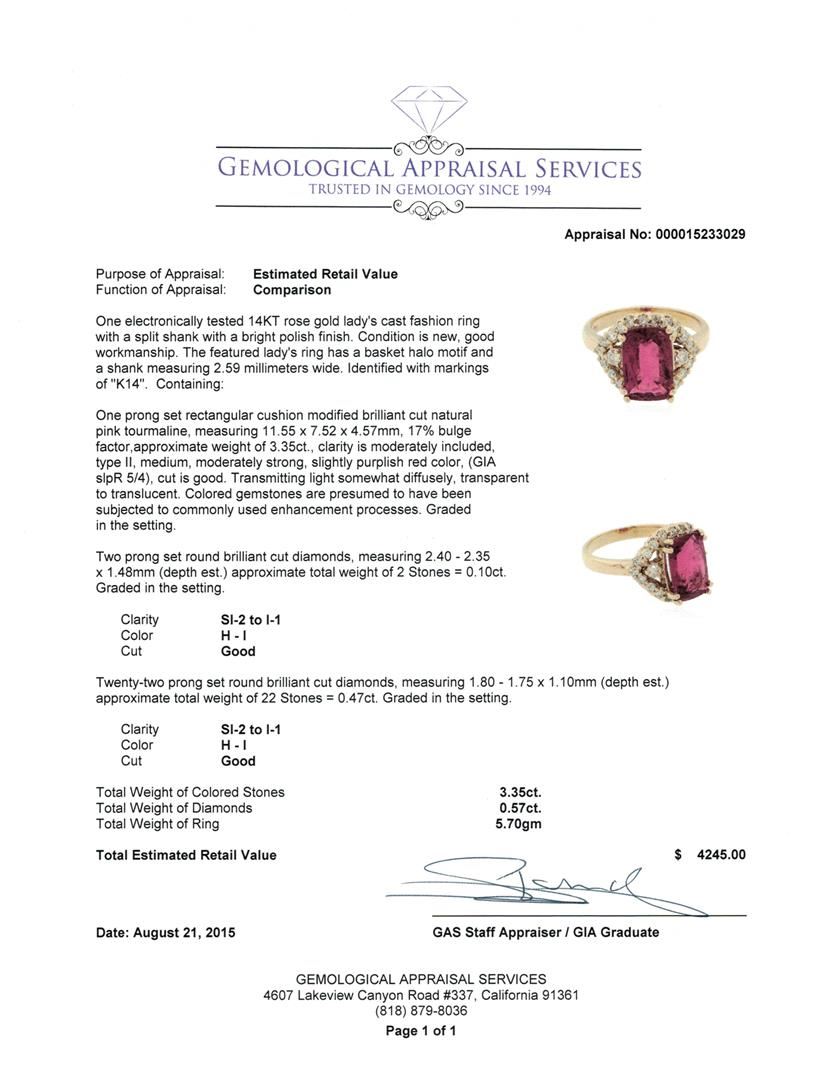 One electronically tested 14KT rose gold lady's cast fashion ring with a split shank with a bright polish finish. The featured lady's ring has a basket halo motif and a shank measuring 2.59 millimeters wide. Identified with markings of "K14". Condition is new, good workmanship. Containing: One prong set rectangular cushion modified brilliant cut natural pink tourmaline, measuring 11.55 x 7.52 x 4.57mm, 17% bulge factor, approximate weight of 3.35ct., clarity is moderately included, type II, medium, moderately strong, slightly purplish red color, (GIA slpR 5/4), cut is good. Transmitting light somewhat diffusely, transparent to translucent. Colored gemstones are presumed to have been subjected to commonly used enhancement processes. Graded in the setting. Two prong set round brilliant cut diamonds, measuring 2.40 - 2.35 x 1.48mm (depth est.) approximate total weight of 2 Stones = 0.10ct. Graded in the setting. Clarity: SI-2 to I-1. Color: H - I. Cut Good Twenty-Two prong set round brilliant cut diamonds, measuring 1.80 - 1.75 x 1.10mm (depth est.) approximate total weight of 22 Stones = 0.47ct. Graded in the setting. Clarity: SI-2 to I-1. Color: H - I. Cut Good. Total Weight of Colored Stones 3.35ct. Total Weight of Diamonds 0.57ct. Total Weight of Ring 5.70gm. GAS Appraised at $4,245.00.