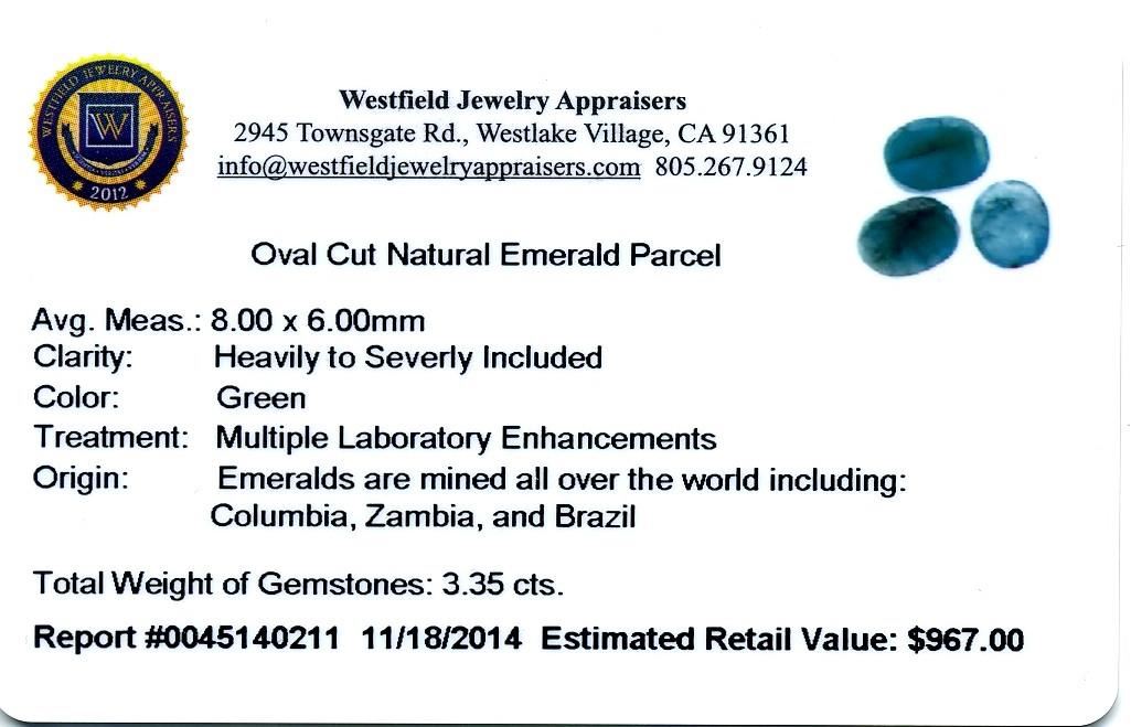3.35cts. Oval Cut Natural Emerald Parcel Westfield Appraised at $967.00.