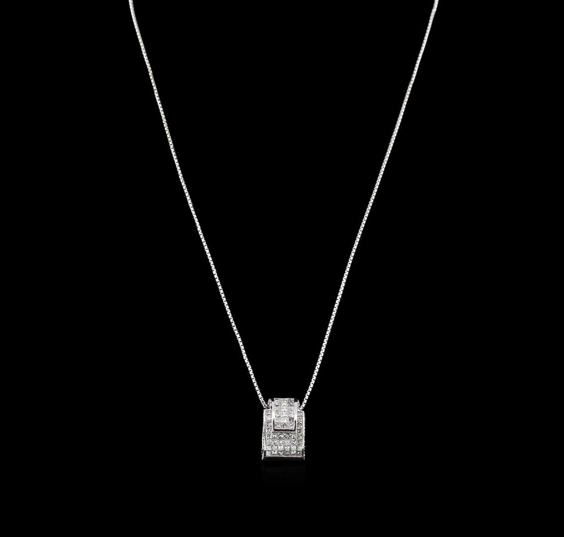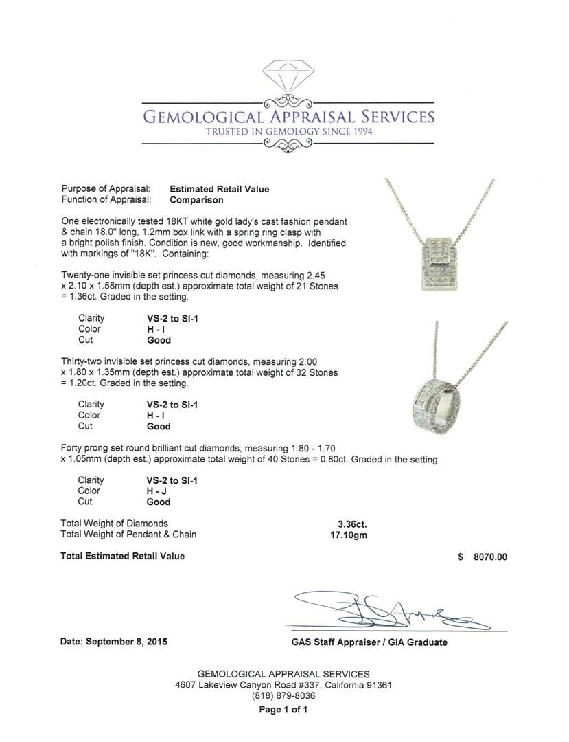 One electronically tested 18KT white gold lady's cast fashion pendant & chain 18.0" long, 1.2mm box link with a spring ring clasp with a bright polish finish. Identified with markings of "18K". Condition is new, good workmanship. Containing: Twenty-One invisible set princess cut diamonds, measuring 2.45 x 2.10 x 1.58mm (depth est.) approximate total weight of 21 Stones = 1.36ct. Graded in the setting. Clarity: VS-2 to SI-1. Color: H - I. Cut Good Thirty-Two invisible set princess cut diamonds, measuring 2.00 x 1.80 x 1.35mm (depth est.) approximate total weight of 32 Stones = 1.20ct. Graded in the setting. Clarity: VS-2 to SI-1. Color: H - I. Cut Good Forty prong set round brilliant cut diamonds, measuring 1.80 - 1.70 x 1.05mm (depth est.) approximate total weight of 40 Stones = 0.80ct. Graded in the setting. Clarity: VS-2 to SI-1. Color: H - Good. Total Weight of Diamonds 3.36ct. Total Weight of Pendant & Chain 17.10gm. GAS Appraised at $8,070.00.