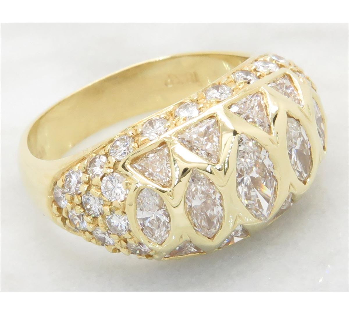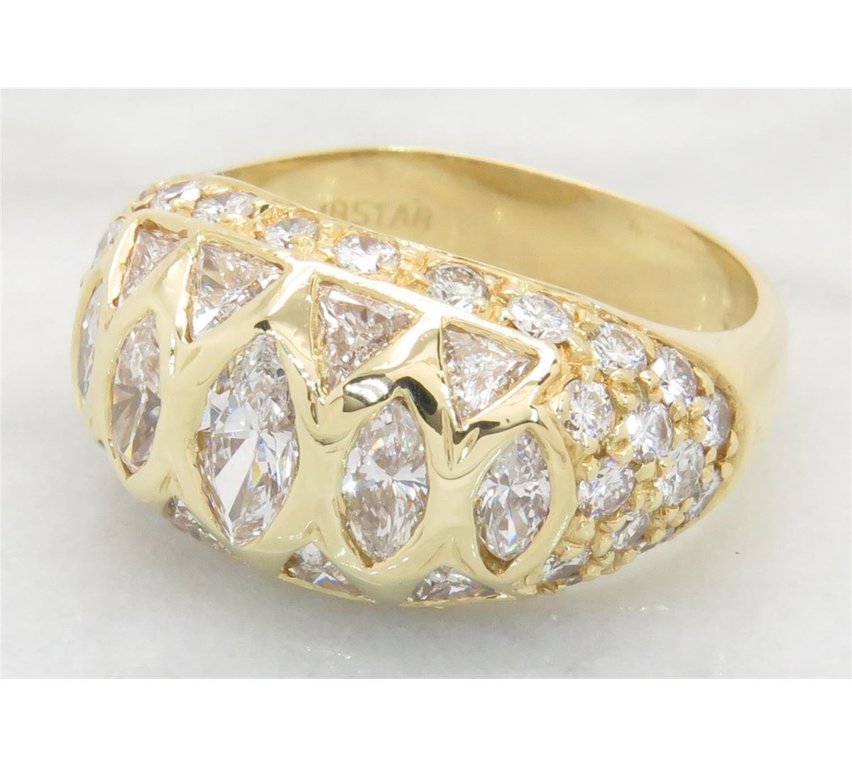 One tested 18K yellow gold designer JB Star diamond ring. Containing: 5 Marquise Cut Diamonds, 8 Trilliant Cut Diamonds, 36 Round Brilliant Cut Diamonds. Clarity: SI-VS, Color: G-H. Approximate total diamond weight: 3.36CTW. Diamonds are graded in the mounting, unless otherwise stated. Weight of ring: 9.4 grams. Size: 6.75.