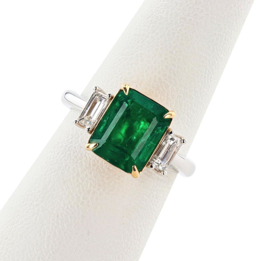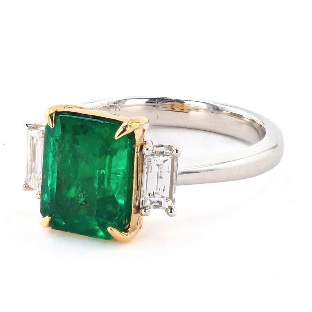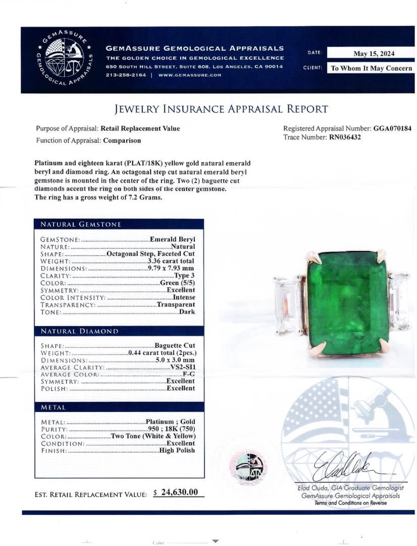 Platinum and eighteen karat (PLAT/18K) yellow gold natural emerald beryl and diamond ring. An octagonal step cut natural emerald beryl gemstone is mounted in the center of the ring. Two (2) baguette cut diamonds accent the ring on both sides of the center gemstone. The ring has a gross weight of 7.2 Grams. #NATURAL GEMSTONE# GEMSTONE: Emerald Beryl NATURE: Natural SHAPE: Octagonal Step, Faceted Cut WEIGHT: 3.36 carat total DIMENSIONS: 9.79 x 7.93mm CLARITY: Type 3 COLOR: Green (5/5) SYMMETRY: Excellent COLOR INTENSITY: Intense TRANSPARENCY: Transparent TONE: Dark #NATURAL DIAMOND# SHAPE: Baguette Cut WEIGHT: 0.44 carat total (2pcs.) DIMENSIONS: 5.0 x 3.0mm AVERAGE CLARITY: VS2-SI1 AVERAGE COLOR: F-G SYMMETRY: Excellent POLISH: Excellent #METAL# METAL: Platinum, Gold PURITY: 950, 18K (750) COLOR: Two Tone (White & Yellow) CONDITION: Excellent FINISH: High Polish Size: 6 1/2