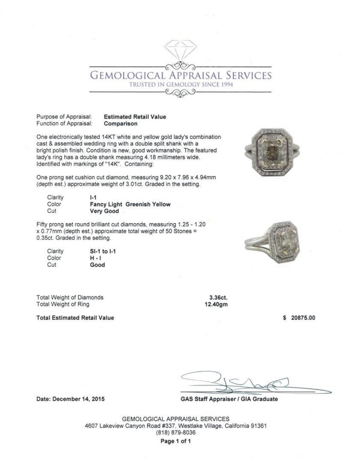 One electronically tested 14KT white and yellow gold lady's combination cast & assembled wedding ring with a double split shank with a bright polish finish. The featured lady's ring has a double shank measuring 4.18 millimeters wide. Identified with markings of "14K". Condition is new, good workmanship. Containing: One prong set cushion cut diamond, measuring 9.20 x 7.96 x 4.94mm (depth est.) approximate weight of 3.01ct. Graded in the setting. Clarity: I-1 Cut Very Good Fifty prong set round brilliant cut diamonds, measuring 1.25 - 1.20 x 0.77mm (depth est.) approximate total weight of 50 Stones = 0.35ct. Graded in the setting. Clarity: SI-1 to I-1. Color: H - I. Cut Good. Total Weight of Diamonds 3.36ct. Total Weight of Ring 12.40gm. GAS Appraised.