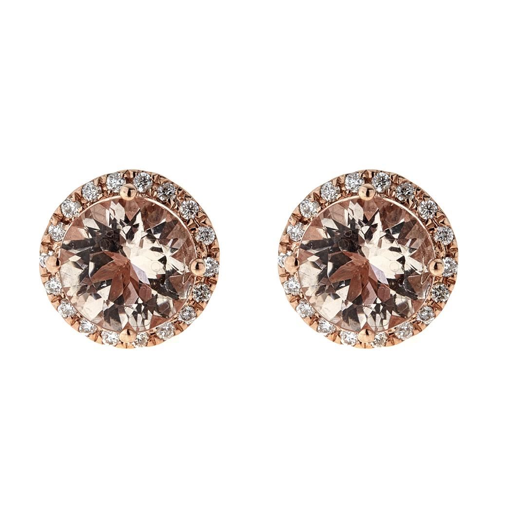 One Pair of Lady's Morganite and Diamond Earrings. Setting: 14 Kt. Rose Gold Mounting. Additional: 36 Round Diamonds = 0.25 Cts. TWT (G-H/VS-SI). Center Gem Stone Information: Species: Natural Beryl. Variety: Morganite. Shape and Cut: Round Mixed Cut. Measurements: 8.12 - 8.16 x 5.00 mm/8.12 - 8.15 x 4.95 mm. Weight: 3.36 Carats Total. Transparency: Transparent. Color Hue: Orangish Pink. Saturation: Light. Total Weight: 2.79 grams.