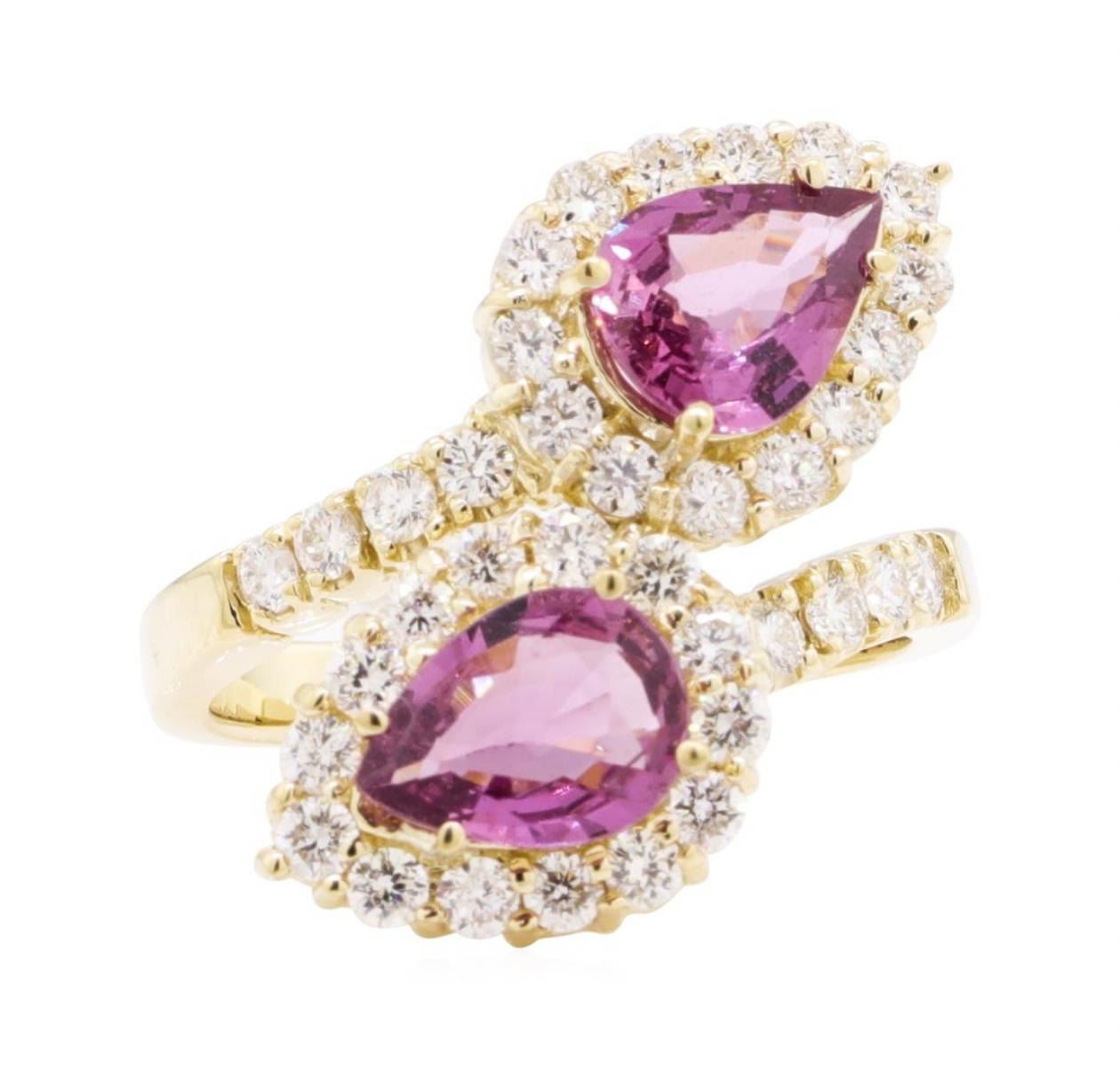One electronically tested 14KT yellow gold lady's cast fashion ring with a bypass shank with a halo with a bright polish finish. The featured lady's ring has a shank measuring 2.40 millimeters wide. Identified with markings of '14K'. Condition is new, good workmanship. Containing: Two prong set pear modified mixed cut natural pink sapphires, measuring 8.10 x 6.15 x 2.85mm, (depth est.) approximate total weight of 2.30ct., clarity is slightly included, medium light, moderately strong, slightly purplish red color, (GIA slpR 4/4), cut is good. Transmitting light with a minimum of distortion, transparent. Colored gemstones are presumed to have been subjected to commonly used enhancement processes. Graded in the setting. Thirty-Six prong set round brilliant cut diamonds, measuring 2.00 - 1.95 x 1.23mm (depth est.) approximate total weight of 36 Stones = 1.06ct. Graded in the setting. Color H - I Clarity VS-2 to SI-2 Cut Very Good. Total Weight of Colored Stones 2.30ct.. Total Weight of Diamonds 1.06ct.. Total Weight of Ring 6.30gm GAS Appraised at $8250.00. GAS Appraised.