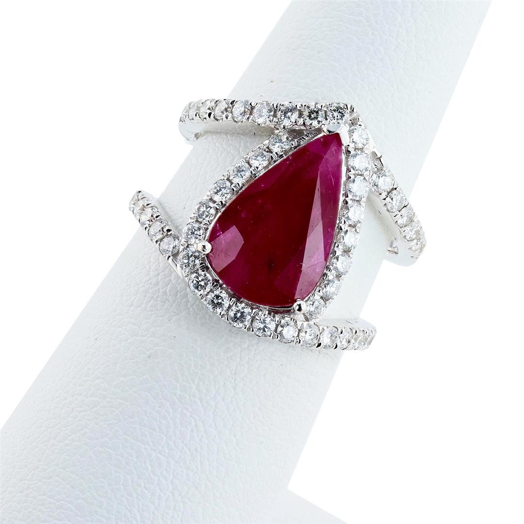 Eighteen karat (18K) white gold natural ruby corundum and diamond ring. A pear brilliant cut natural ruby corundum gemstone is mounted in the center of the ring. Round brilliant cut diamonds accent the ring around ana on uotn swes ot tne center gemstone.