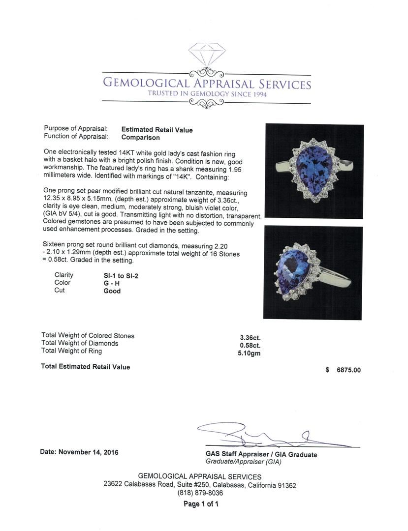 One electronically tested 14KT white gold lady's cast fashion ring with a basket halo with a bright polish finish. The featured lady's ring has a shank measuring 1.95 millimeters wide. Identified with markings of '14K'. Condition is new, good workmanship. Containing: One prong set pear modified brilliant cut natural tanzanite, measuring 12.35 x 8.95 x 5.15mm, (depth est.) approximate weight of 3.36ct., clarity is eye clean, medium, moderately strong, bluish violet color, (GIA bV 5/4), cut is good. Transmitting light with no distortion, transparent. Colored gemstones are presumed to have been subjected to commonly used enhancement processes. Graded in the setting. Sixteen prong set round brilliant cut diamonds, measuring 2.20 - 2.10 x 1.29mm (depth est.) approximate total weight of 16 Stones = 0.58ct. Graded in the setting. Clarity SI-1 to SI-2. Color: G - H Cut Good. Total Weight of Colored Stones 3.36ct.. Total Weight of Diamonds 0.58ct.. Total Weight of Ring 5.10gm GAS Appraised at $6,875.00.