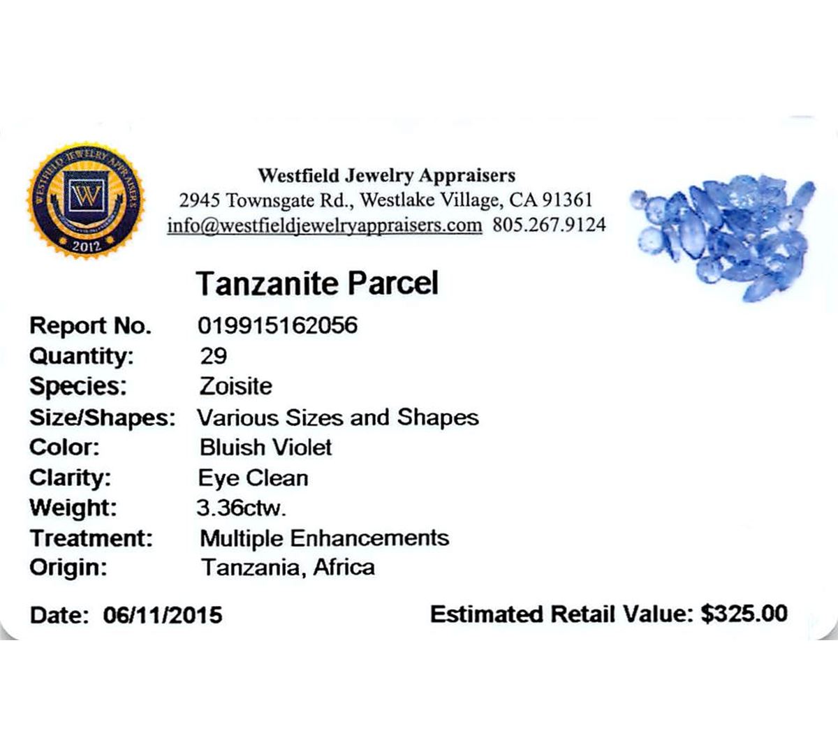 Twenty-nine mixed cut natural tanzanites exact total weight 3.36ct., clarity is eye clean, type I, medium dark, very slightly grayish, bluish violet color, (GIA bV 6/3), cut is good. Transmitting light with no distortion, transparent. Color grade is an average for the group. Graded in the setting. Tanzanite is a very rare gemstone that is only found in the country of Tanzania. Originally discovered in 1967. Tiffany & Company, named the stone Tanzanite. It is found in the Usumburu Mountains that border the Umba Valley of northern Tanzania. Tanzanite occurs in gray, brown, violet, blue, reddish-purple, & green. The gem is interesting because of its exceptional pleochroism. Rotated in different directions a tanzanite will exhibit multiple changes of color. Tanzanite has a low tolerance to ultrasonic cleaning, and should not be cleaned using this method. Westfield Appraised at $325.00.