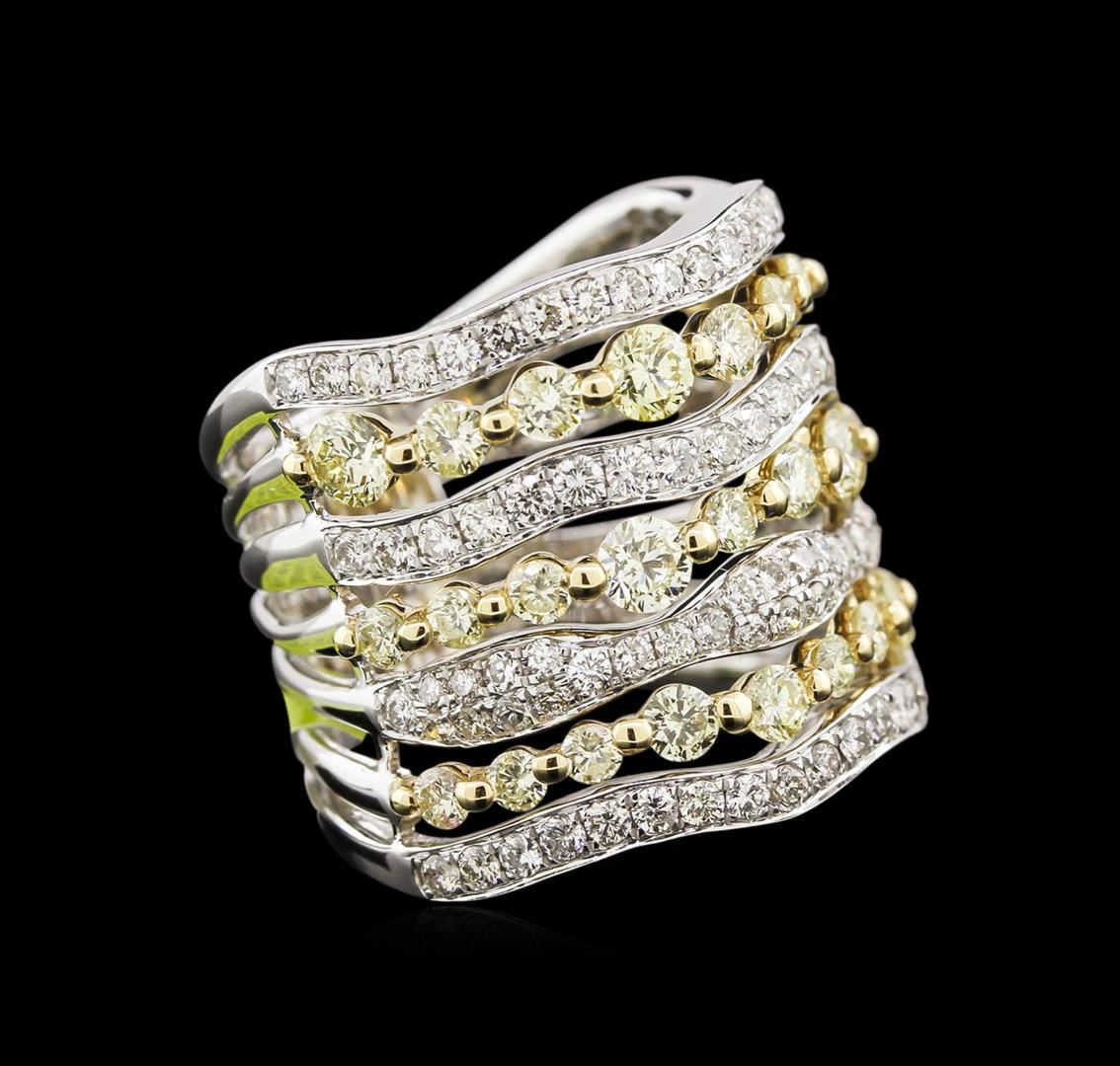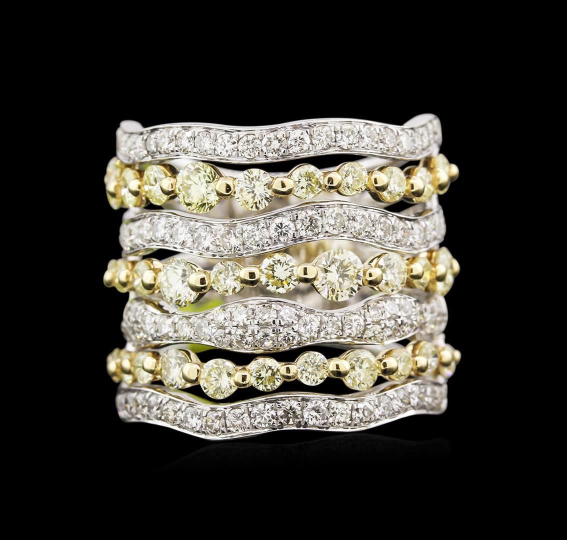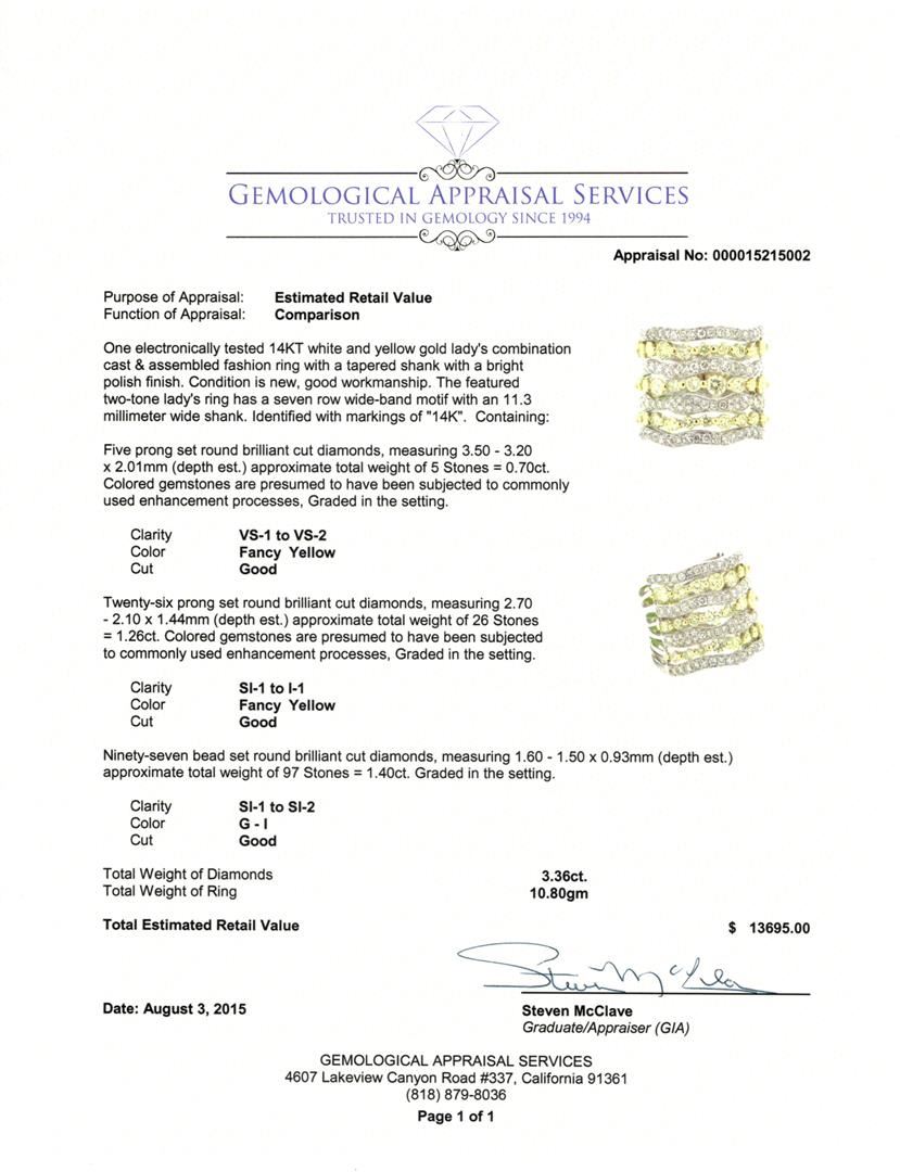 One electronically tested 14KT white and yellow gold lady's combination cast & assembled fashion ring with a tapered shank with a bright polish finish. The featured two-tone lady's ring has a seven row wide-band motif with an 11.3 millimeter wide shank. Identified with markings of "14K". Condition is new, good workmanship. Containing: Five prong set round brilliant cut diamonds, measuring 3.50 - 3.20 x 2.01mm (depth est.) approximate total weight of 5 Stones = 0.70ct. Colored gemstones are presumed to have been subjected to commonly used enhancement processes, Graded in the setting. Clarity VS-1 to VS-2 Cut Good Twenty-Six prong set round brilliant cut diamonds, measuring 2.70 - 2.10 x 1.44mm (depth est.) approximate total weight of 26 Stones = 1.26ct. Colored gemstones are presumed to have been subjected to commonly used enhancement processes, Graded in the setting. Clarity SI-1 to I-1 Cut Good Ninety-Seven bead set round brilliant cut diamonds, measuring 1.60 - 1.50 x 0.93mm (depth est.) approximate total weight of 97 Stones = 1.40ct. Graded in the setting. Clarity SI-1 to SI-2 Color G - I. Cut Good Total Weight of Diamonds 3.36ct. Total Weight of Ring 10.80gm GAS Appraised at $13,695.00.