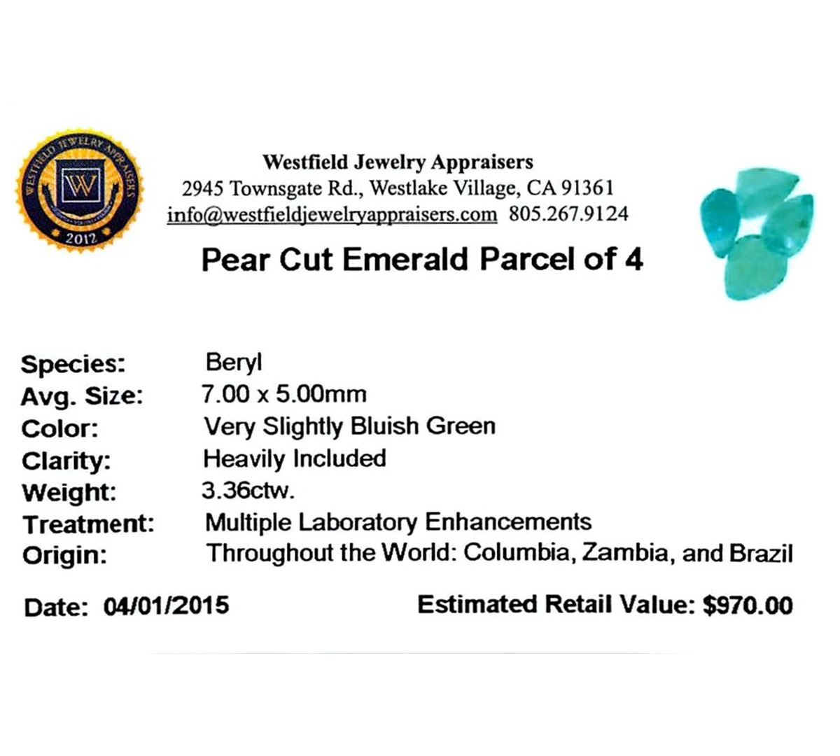 Four pear mixed cut natural emeralds exact total weight 3.36ct., clarity is heavily included, type III, medium, very slightly grayish, very slightly bluish green color, (GIA vslbG 5/3), cut is good. Westfield Appraised at $970.00.