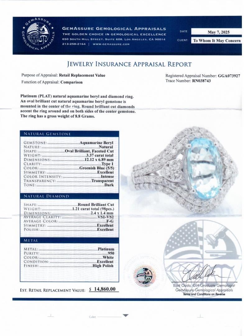 Platinum (PLAT) natural aquamarine beryl and diamond ring. An oval brilliant cut natural aquamarine beryl gemstone is mounted in the center of the ring. Round brilliant cut diamonds accent the ring around and on both sides of the center gemstone. The ring has a gross weight of 8.8 Grams. Brand: Walter Gruen #NATURAL GEMSTONE# GEMSTONE: Aquamarine Beryl; NATURE: Natural; SHAPE: Oval Brilliant, Faceted Cut; WEIGHT: 3.37 carat total; DIMENSIONS: 12.12 x 6.89mm; CLARITY: Type 1; COLOR: Greenish Blue (5/5); SYMMETRY: Excellent; COLOR INTENSITY: Intense; TRANSPARENCY: Transparent; TONE: Dark #NATURAL DIAMOND# SHAPE: Round Brilliant Cut; WEIGHT: 1.21 carat total (98pcs.); DIMENSIONS: 2.4 x 1.4mm; AVERAGE CLARITY: VS1-VS2; AVERAGE COLOR: F-G; SYMMETRY: Excellent; POLISH: Excellent #METAL# METAL: Platinum; PURITY: 950; COLOR: White; CONDITION: Excellent; FINISH: High Polish #Size: 7