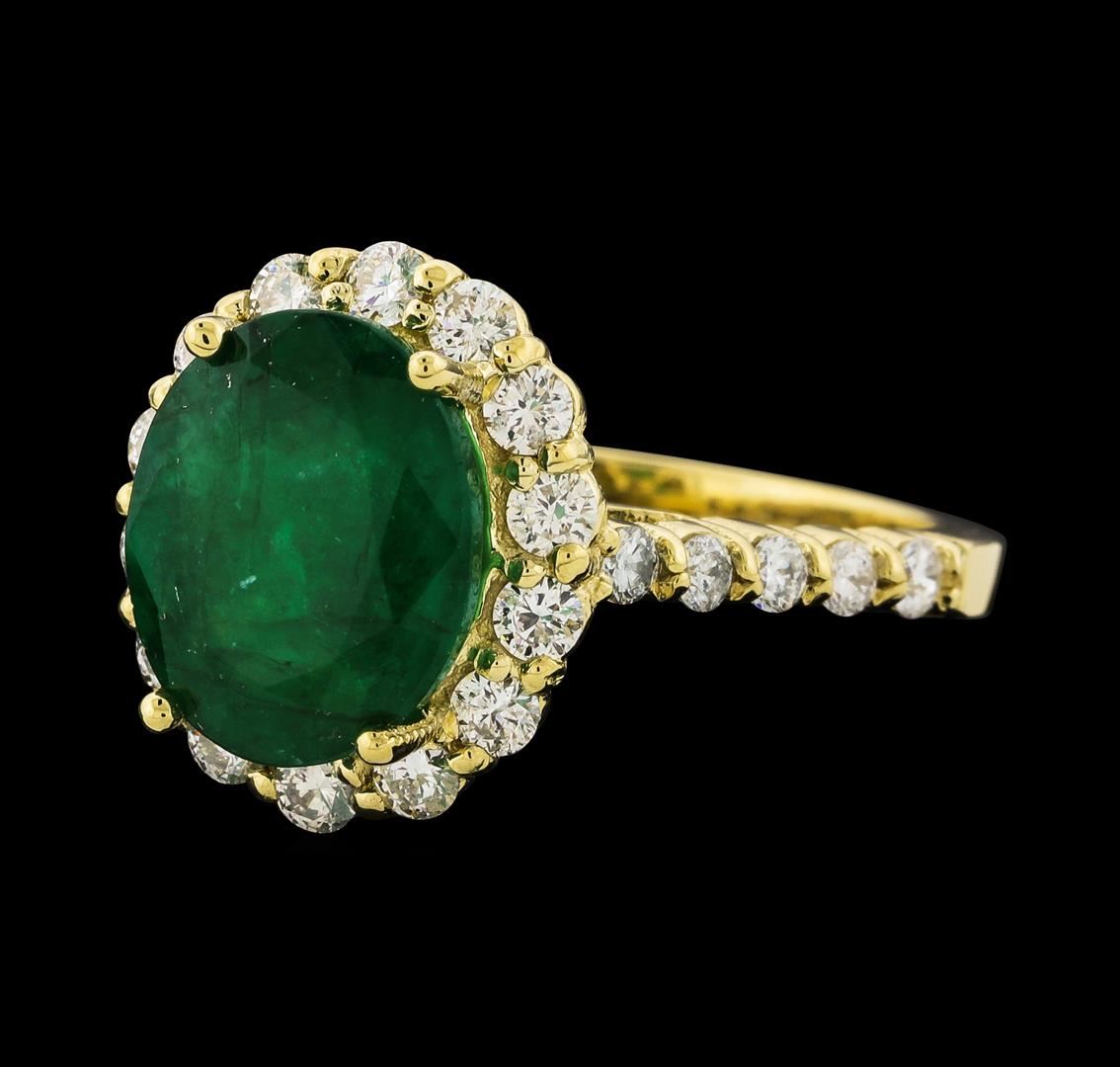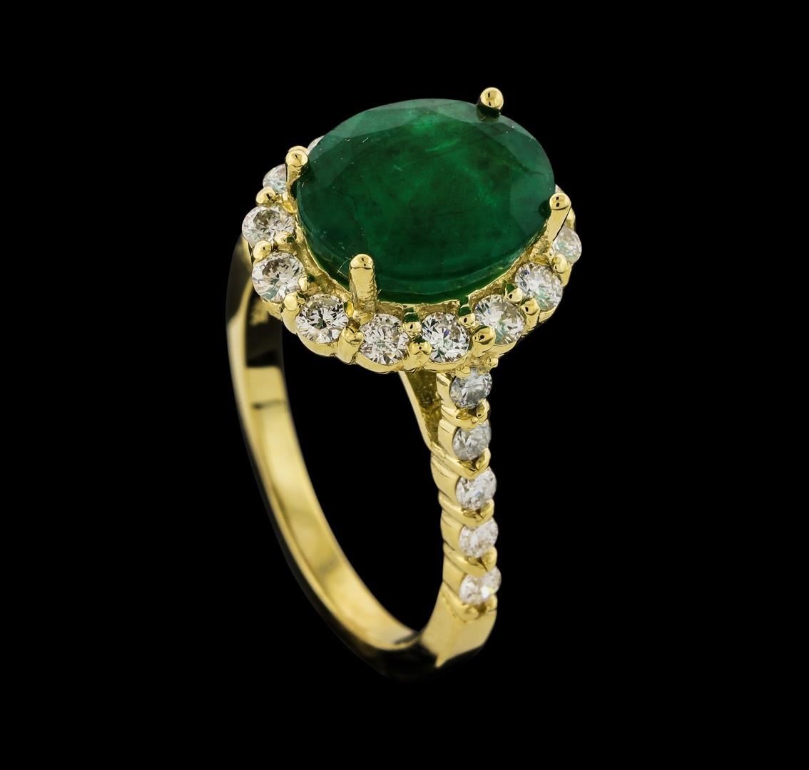 One electronically tested 14KT yellow gold lady's cast fashion ring with a basket halo with a bright polish finish. The featured lady's ring has a shank measuring 2.00 millimeters wide. Identified with markings of '14K'. Condition is new, good workmanship. Containing: One prong set oval modified mixed cut natural emerald, measuring 10.70 x 8.80 x 6.10mm, (depth est.) approximate weight of 3.37ct., clarity is heavily included, medium dark, moderately strong, green color, (GIA G 6/4), cut is good. Transmitting light somewhat diffusely, semi-transparent to translucent. Naturally occurring internal & external characteristics are present. Indications of oil residue. Colored gemstones are presumed to have been subjected to commonly used enhancement processes. Graded in the setting. Fourteen prong set round brilliant cut diamonds, measuring 2.20 - 2.10 x 1.29mm (depth est.) approximate total weight of 14 Stones = 0.50ct. Graded in the setting. Clarity SI-1 to SI-2. Color: G - H Cut Good Twelve prong set round brilliant cut diamonds, measuring 1.90 - 1.85 x 1.17mm (depth est.) approximate total weight of 12 Stones = 0.30ct. Graded in the setting. Clarity SI-1 to SI-2. Color: G - H Cut Good. Total Weight of Colored Stones 3.37ct.. Total Weight of Diamonds 0.80ct.. Total Weight of Ring 4.70gm. GAS Appraised.