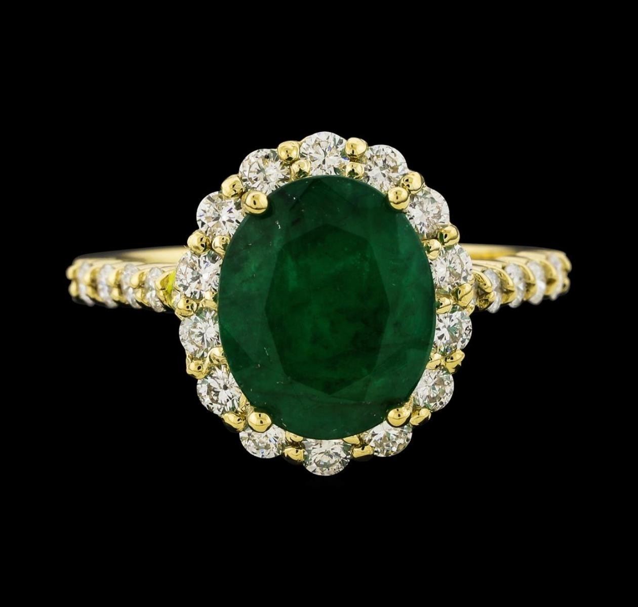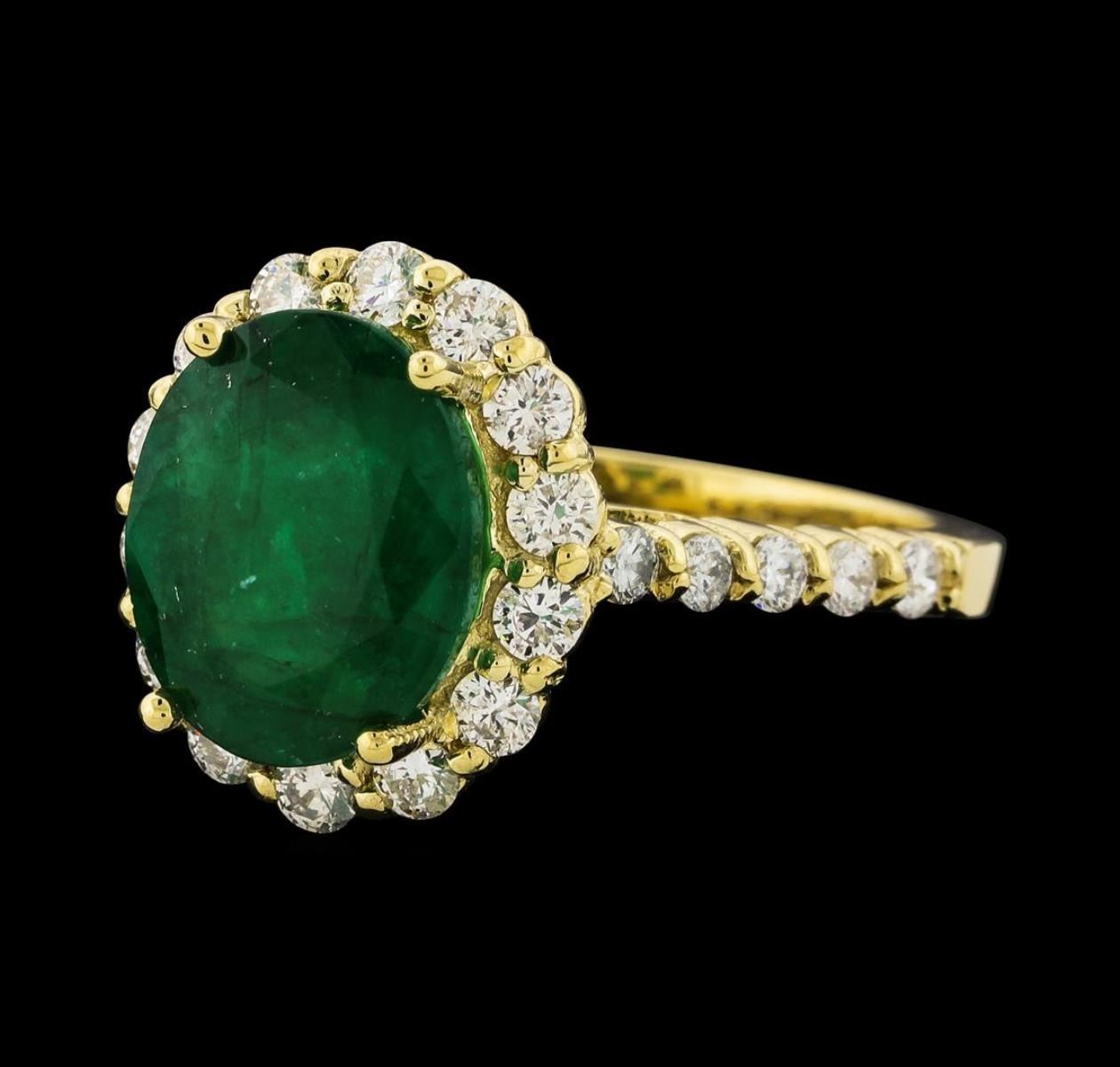 One electronically tested 14KT yellow gold lady's cast fashion ring with a basket halo with a bright polish finish. The featured lady's ring has a shank measuring 2.00 millimeters wide. Identified with markings of '14K'. Condition is new, good workmanship. Containing: One prong set oval modified mixed cut natural emerald, measuring 10.70 x 8.80 x 6.10mm, (depth est.) approximate weight of 3.37ct., clarity is heavily included, medium dark, moderately strong, green color, (GIA G 6/4), cut is good. Transmitting light somewhat diffusely, semi-transparent to translucent. Naturally occurring internal & external characteristics are present. Indications of oil residue. Colored gemstones are presumed to have been subjected to commonly used enhancement processes. Graded in the setting. Fourteen prong set round brilliant cut diamonds, measuring 2.20 - 2.10 x 1.29mm (depth est.) approximate total weight of 14 Stones = 0.50 ct. Graded in the setting. Clarity SI-1 to SI-2. Color: G - H Cut Good Twelve prong set round brilliant cut diamonds, measuring 1.90 - 1.85 x 1.17mm (depth est.) approximate total weight of 12 Stones = 0.30 ct. Graded in the setting. Clarity SI-1 to SI-2. Color: G - H Cut Good. Total Weight of Colored Stones 3.37ct.. Total Weight of Diamonds 0.80 ct.. Total Weight of Ring 4.70gm. GAS Appraised.