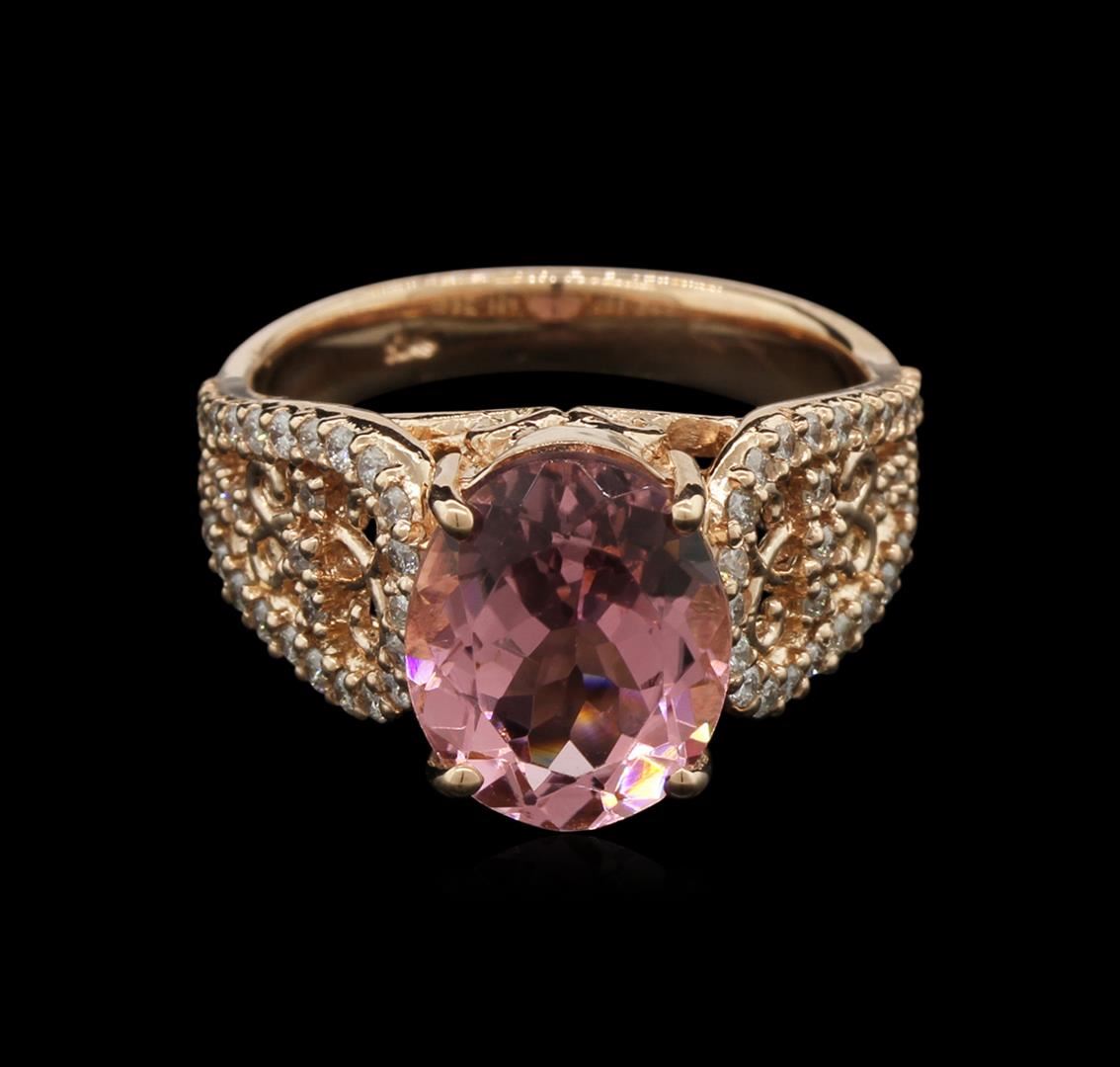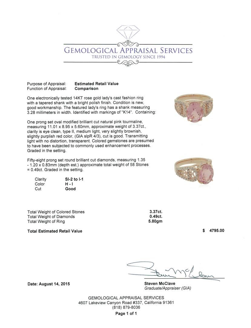 One electronically tested 14KT rose gold lady's cast fashion ring with a tapered shank with a bright polish finish. The featured lady's ring has a shank measuring 3.28 millimeters in width. Identified with markings of "K14". Condition is new, good workmanship. Containing: One prong set oval modified brilliant cut natural pink tourmaline, measuring 11.01 x 8.95 x 5.60mm, approximate weight of 3.37ct., clarity is eye clean, type II, medium light, very slightly brownish, slightly purplish red color, (GIA slpR 4/3), cut is good. Transmitting light with no distortion, transparent. Colored gemstones are presumed to have been subjected to commonly used enhancement processes. Graded in the setting. Fifty-Eight prong set round brilliant cut diamonds, measuring 1.35 - 1.20 x 0.83mm (depth est.) approximate total weight of 58 Stones = 0.49ct. Graded in the setting. Clarity: SI-2 to I-1. Color: H - I. Cut Good. Total Weight of Colored Stones 3.37ct. Total Weight of Diamonds 0.49ct. Total Weight of Ring 5.80gm. GAS Appraised at $4,795.00.