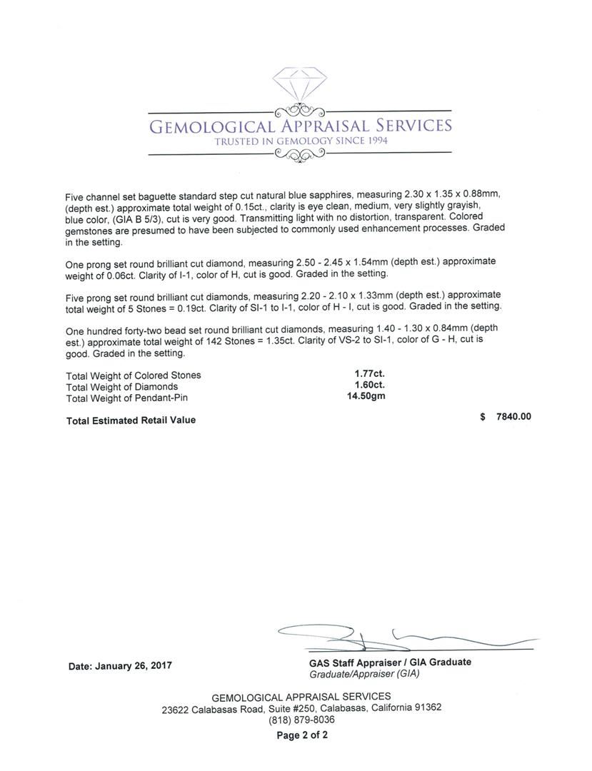 One electronically tested 18KT yellow gold lady's combination cast & assembled fashion pendant-pin with a bright polish finish. Identified with markings of '750'. Condition is new, good workmanship. Containing: Two prong set pear modified brilliant cut natural rubies, measuring 4.05 x 3.00 x 1.65mm, (depth est.) approximate total weight of 0.32ct., clarity is eye clean, medium, moderately strong, slightly purplish red color, (GIA slpR 5/4), cut is very good. Transmitting light with no distortion, transparent. Colored gemstones are presumed to have been subjected to commonly used enhancement processes. Graded in the setting. Seven channel set baguette modified step cut natural rubies, measuring 2.40 x 1.75 x 1.14mm, (depth est.) approximate total weight of 0.35ct., clarity is eye clean, medium, moderately strong, slightly purplish red color, (GIA slpR 5/4), cut is very good. Transmitting light with no distortion, transparent. Colored gemstones are presumed to have been subjected to commonly used enhancement processes. Graded in the setting. One prong set pear modified mixed cut natural emerald, measuring 5.00 x 3.10 x 2.50mm, (depth est.) approximate weight of 0.21ct., clarity is slightly included, medium, moderately strong, green color, (GIA G 5/4), cut is very good. Transmitting light with a minimum of distortion, transparent. Indications of oil residue. Colored gemstones are presumed to have been subjected to commonly used enhancement processes. Graded in the setting. Six prong set marquise modified brilliant cut natural emeralds, measuring 4.00 x 2.15 x 1.40mm, (depth est.) approximate total weight of 0.36ct., clarity is slightly included, medium, moderately strong, green color, (GIA G 5/4), cut is good. Transmitting light with a minimum of distortion, transparent. Indications of oil residue. Colored gemstones are presumed to have been subjected to commonly used enhancement processes. Graded in the setting. Two prong set pear modified mixed cut natural blue sapphires, measuring 4.10 x 2.90 x 2.00mm, (depth est.) approximate total weight of 0.38ct., clarity is eye clean, medium dark, moderately strong, blue color, (GIA B 6/4), cut is very good. Transmitting light with no distortion, transparent. Colored gemstones are presumed to have been subjected to commonly used enhancement processes. Graded in the setting. Five channel set baguette standard step cut natural blue sapphires, measuring 2.30 x 1.35 x 0.88mm, (depth est.) approximate total weight of 0.15ct., clarity is eye clean, medium, very slightly grayish, blue color, (GIA B 5/3), cut is very good. Transmitting light with no distortion, transparent. Colored gemstones are presumed to have been subjected to commonly used enhancement processes. Graded in the setting. One prong set round brilliant cut diamond, measuring 2.50 - 2.45 x 1.54mm (depth est.) approximate weight of 0.06ct. Graded in the setting. Color H Clarity I-1 Cut Good Five prong set round brilliant cut diamonds, measuring 2.20 - 2.10 x 1.33mm (depth est.) approximate total weight of 5 Stones = 0.19ct. Graded in the setting. Color H - I Clarity SI-1 to I-1 Cut Good One Hundred Forty-Two bead set round brilliant cut diamonds, measuring 1.40 - 1.30 x 0.84mm (depth est.) approximate total weight of 142 Stones = 1.35ct. Graded in the setting. Color G - H Clarity VS-2 to SI-1 Cut Good. Total Weight of Colored Stones 1.77ct.. Total Weight of Diamonds 1.60ct.. Total Weight of Pendant-Pin 14.50gm. GAS Appraised at $7,840.00.