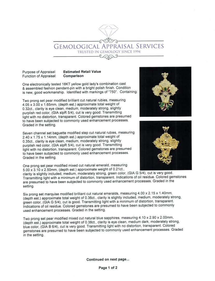 One electronically tested 18KT yellow gold lady's combination cast & assembled fashion pendant-pin with a bright polish finish. Identified with markings of '750'. Condition is new, good workmanship. Containing: Two prong set pear modified brilliant cut natural rubies, measuring 4.05 x 3.00 x 1.65mm, (depth est.) approximate total weight of 0.32ct., clarity is eye clean, medium, moderately strong, slightly purplish red color, (GIA slpR 5/4), cut is very good. Transmitting light with no distortion, transparent. Colored gemstones are presumed to have been subjected to commonly used enhancement processes. Graded in the setting. Seven channel set baguette modified step cut natural rubies, measuring 2.40 x 1.75 x 1.14mm, (depth est.) approximate total weight of 0.35ct., clarity is eye clean, medium, moderately strong, slightly purplish red color, (GIA slpR 5/4), cut is very good. Transmitting light with no distortion, transparent. Colored gemstones are presumed to have been subjected to commonly used enhancement processes. Graded in the setting. One prong set pear modified mixed cut natural emerald, measuring 5.00 x 3.10 x 2.50mm, (depth est.) approximate weight of 0.21ct., clarity is slightly included, medium, moderately strong, green color, (GIA G 5/4), cut is very good. Transmitting light with a minimum of distortion, transparent. Indications of oil residue. Colored gemstones are presumed to have been subjected to commonly used enhancement processes. Graded in the setting. Six prong set marquise modified brilliant cut natural emeralds, measuring 4.00 x 2.15 x 1.40mm, (depth est.) approximate total weight of 0.36ct., clarity is slightly included, medium, moderately strong, green color, (GIA G 5/4), cut is good. Transmitting light with a minimum of distortion, transparent. Indications of oil residue. Colored gemstones are presumed to have been subjected to commonly used enhancement processes. Graded in the setting. Two prong set pear modified mixed cut natural blue sapphires, measuring 4.10 x 2.90 x 2.00mm, (depth est.) approximate total weight of 0.38ct., clarity is eye clean, medium dark, moderately strong, blue color, (GIA B 6/4), cut is very good. Transmitting light with no distortion, transparent. Colored gemstones are presumed to have been subjected to commonly used enhancement processes. Graded in the setting. Five channel set baguette standard step cut natural blue sapphires, measuring 2.30 x 1.35 x 0.88mm, (depth est.) approximate total weight of 0.15ct., clarity is eye clean, medium, very slightly grayish, blue color, (GIA B 5/3), cut is very good. Transmitting light with no distortion, transparent. Colored gemstones are presumed to have been subjected to commonly used enhancement processes. Graded in the setting. One prong set round brilliant cut diamond, measuring 2.50 - 2.45 x 1.54mm (depth est.) approximate weight of 0.06ct. Graded in the setting. Color H Clarity I-1 Cut Good Five prong set round brilliant cut diamonds, measuring 2.20 - 2.10 x 1.33mm (depth est.) approximate total weight of 5 Stones = 0.19ct. Graded in the setting. Color H - I Clarity SI-1 to I-1 Cut Good One Hundred Forty-Two bead set round brilliant cut diamonds, measuring 1.40 - 1.30 x 0.84mm (depth est.) approximate total weight of 142 Stones = 1.35ct. Graded in the setting. Color G - H Clarity VS-2 to SI-1 Cut Good. Total Weight of Colored Stones 1.77ct.. Total Weight of Diamonds 1.60ct.. Total Weight of Pendant-Pin 14.50gm. GAS Appraised.