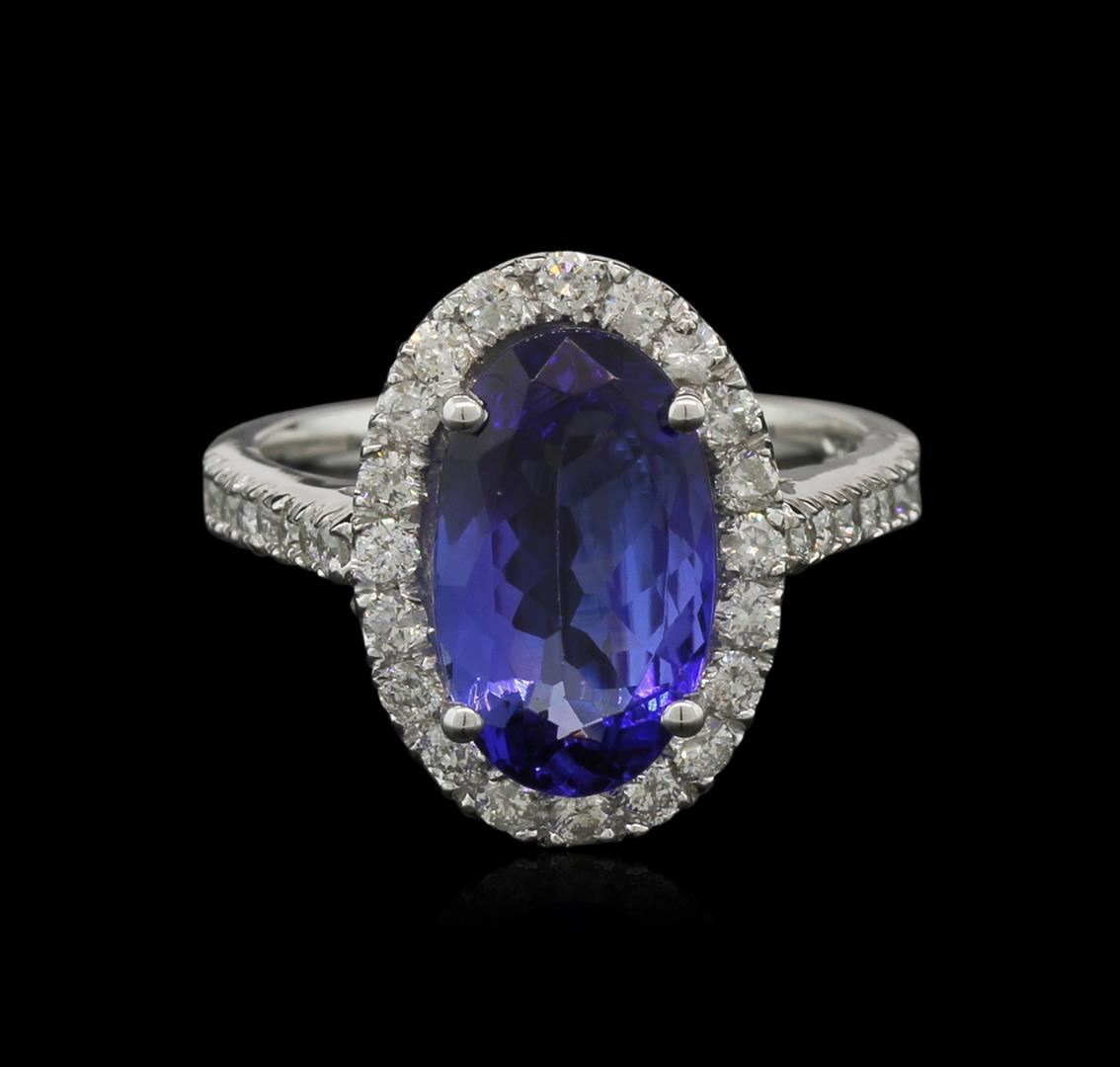 One electronically tested 14KT white gold lady's cast fashion ring with a halo with a bright polish finish. The featured lady's ring has a shank measuring 2.55 millimeters in width. Identified with markings of "14K". Condition is new, good workmanship. Containing: One prong set oval modified brilliant cut natural tanzanite, measuring 12.94 x 7.77 x 4.37mm, 10% bulge factor, approximate weight of 3.37ct., clarity is eye clean, type I, medium dark, very slightly grayish, violetish blue color, (GIA vB 6/3), cut is very good. Transmitting light with no distortion, transparent. Colored gemstones are presumed to have been subjected to commonly used enhancement processes. Graded in the setting. Thirty-Four split prong set round brilliant cut diamonds, measuring 1.80 - 1.70 x 1.05mm (depth est.) approximate total weight of 34 Stones = 0.67ct. Graded in the setting. Clarity: SI-2 to I-1. Color: H - I. Cut Good. Total Weight of Colored Stones 3.37ct. Total Weight of Diamonds 0.67ct. Total Weight of Ring 5.40gm. GAS Appraised at $7,020.00.