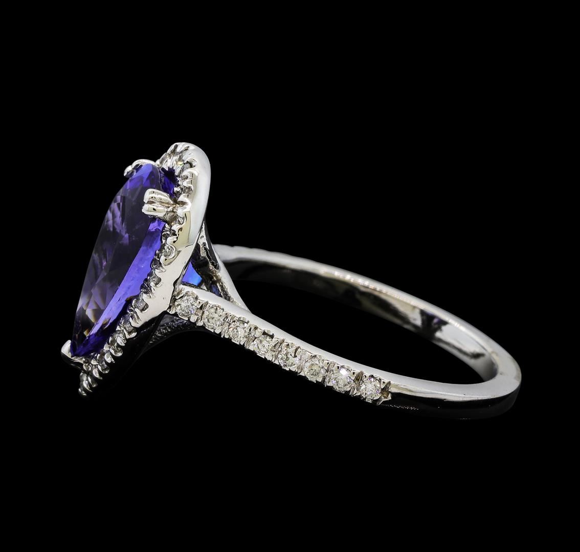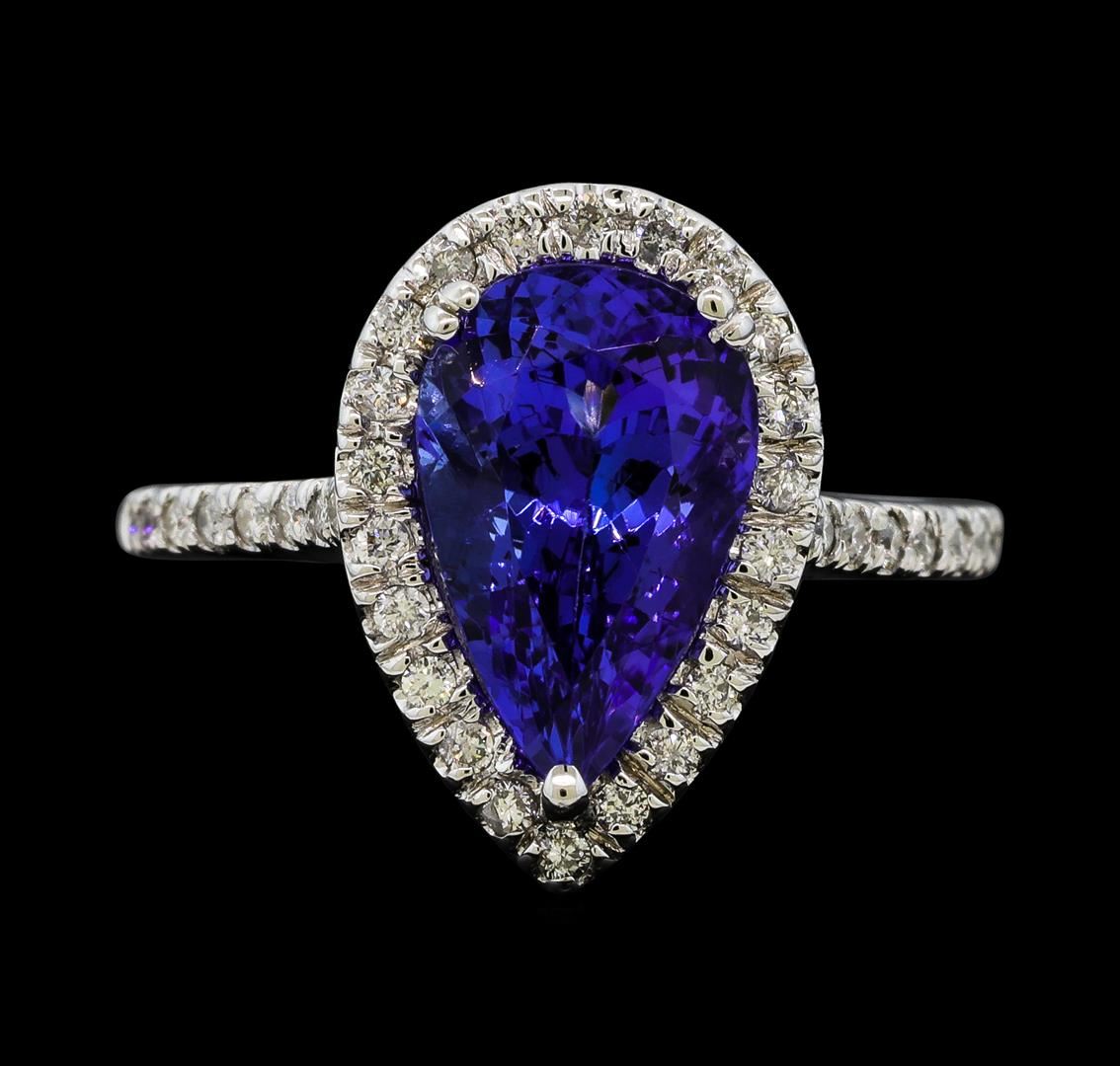 One electronically tested 14KT white gold lady's cast fashion ring with a cathedral halo with a bright polish finish. The featured lady's ring has a shank measuring 1.83 millimeters wide. Identified with markings of '14K'. Condition is new, good workmanship. Containing: One prong set pear modified brilliant cut natural tanzanite, measuring 12.25 x 7.67 x 6.10mm, (depth est.) approximate weight of 3.37ct., clarity is eye clean, medium dark, strong, violetish blue color, (GIA vB 6/5), cut is very good. Transmitting light with no distortion, transparent. Colored gemstones are presumed to have been subjected to commonly used enhancement processes. Graded in the setting. Thirty-Eight prong set round brilliant cut diamonds, measuring 1.40 - 1.30 x 0.82mm (depth est.) approximate total weight of 38 Stones = 0.35ct. Graded in the setting. Clarity SI-1 to I-1. Color: G - I Cut Good. Total Weight of Colored Stones 3.37ct.. Total Weight of Diamonds 0.35ct.. Total Weight of Ring 4.10gm. GAS Appraised at $7,500.00.