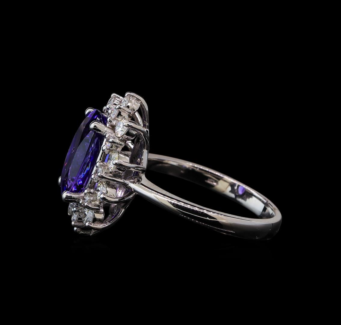 One electronically tested 14KT white gold lady's cast fashion ring with a scalloped basket halo with a bright polish finish. The featured lady's ring has a shank measuring 2.47 millimeters wide. Identified with markings of 'K14'. Condition is new, good workmanship. Containing: One prong set oval modified brilliant cut natural tanzanite, measuring 11.59 x 7.85 x 5.35mm, (depth est.) approximate weight of 3.37ct., clarity is eye clean, medium dark, strong, violetish blue color, (GIA vB 6/5), cut is very good. Transmitting light with no distortion, transparent. Colored gemstones are presumed to have been subjected to commonly used enhancement processes. Graded in the setting. Ten prong set round brilliant cut diamonds, measuring 2.50 - 2.40 x 1.47mm (depth est.) approximate total weight of 10 Stones = 0.54ct. Graded in the setting. Clarity SI-1 to SI-2. Color: H - I Cut Good Ten prong set round brilliant cut diamonds, measuring 1.80 - 1.70 x 1.09mm (depth est.) approximate total weight of 10 Stones = 0.21ct. Graded in the setting. Clarity SI-1 to SI-2. Color: H - I Cut Good. Total Weight of Colored Stones 3.37ct. Total Weight of Diamonds 0.75ct. Total Weight of Ring 5.50gm. GAS Appraised at $8,390.00.