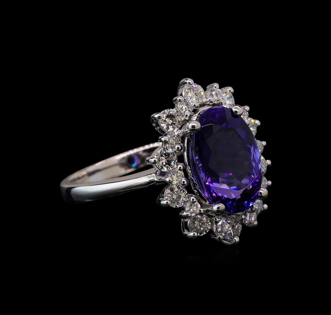 One electronically tested 14KT white gold lady's cast fashion ring with a scalloped basket halo with a bright polish finish. The featured lady's ring has a shank measuring 2.47 millimeters wide. Identified with markings of 'K14'. Condition is new, good workmanship. Containing: One prong set oval modified brilliant cut natural tanzanite, measuring 11.59 x 7.85 x 5.35mm, (depth est.) approximate weight of 3.37ct., clarity is eye clean, medium dark, strong, violetish blue color, (GIA vB 6/5), cut is very good. Transmitting light with no distortion, transparent. Colored gemstones are presumed to have been subjected to commonly used enhancement processes. Graded in the setting. Ten prong set round brilliant cut diamonds, measuring 2.50 - 2.40 x 1.47mm (depth est.) approximate total weight of 10 Stones = 0.54ct. Graded in the setting. Clarity SI-1 to SI-2. Color: H - I Cut Good Ten prong set round brilliant cut diamonds, measuring 1.80 - 1.70 x 1.09mm (depth est.) approximate total weight of 10 Stones = 0.21ct. Graded in the setting. Clarity SI-1 to SI-2. Color: H - I Cut Good. Total Weight of Colored Stones 3.37ct. Total Weight of Diamonds 0.75ct. Total Weight of Ring 5.50gm. GAS Appraised at $8,390.00.