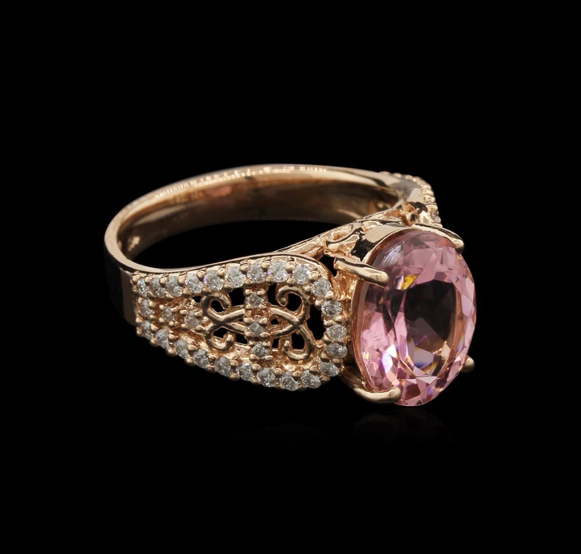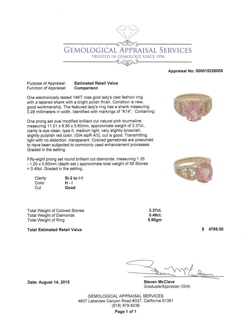 One electronically tested 14KT rose gold lady's cast fashion ring with a tapered shank with a bright polish finish. The featured lady's ring has a shank measuring 3.28 millimeters in width. Identified with markings of "K14". Condition is new, good workmanship. Containing: One prong set oval modified brilliant cut natural pink tourmaline, measuring 11.01 x 8.95 x 5.60mm, approximate weight of 3.37ct., clarity is eye clean, type II, medium light, very slightly brownish, slightly purplish red color, (GIA slpR 4/3), cut is good. Transmitting light with no distortion, transparent. Colored gemstones are presumed to have been subjected to commonly used enhancement processes. Graded in the setting. Fifty-Eight prong set round brilliant cut diamonds, measuring 1.35 - 1.20 x 0.83mm (depth est.) approximate total weight of 58 Stones = 0.49ct. Graded in the setting. Clarity: SI-2 to I-1. Color: H - I. Cut Good. Total Weight of Colored Stones 3.37ct. Total Weight of Diamonds 0.49ct. Total Weight of Ring 5.80gm. GAS Appraised at $4,795.00.