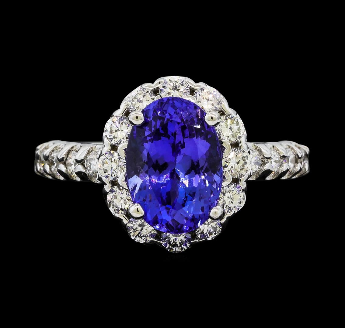 One electronically tested 14KT white gold lady's cast fashion ring with a cathedral halo with a bright polish finish. The featured lady's ring has a shank measuring 2.08 millimeters wide. Identified with markings of '14K'. Condition is new, good workmanship. Containing: One prong set oval modified brilliant cut natural tanzanite, measuring 10.55 x 7.40 x 6.00mm, (depth est.) 3%. bulge factor, approximate weight of 3.38ct., clarity is eye clean, medium dark, strong, violetish blue color, (GIA vB 6/5), cut is very good. Transmitting light with no distortion, transparent. Colored gemstones are presumed to have been subjected to commonly used enhancement processes. Graded in the setting. Twelve prong set round brilliant cut diamonds, measuring 2.40 - 2.35 x 1.48mm (depth est.) approximate total weight of 12 Stones = 0.62ct. Graded in the setting. Clarity VS-2 to SI-2. Color: G - H Cut Good Ten prong set round brilliant cut diamonds, measuring 2.10 - 2.05 x 1.29mm (depth est.) approximate total weight of 10 Stones = 0.35ct. Graded in the setting. Clarity SI-1 to SI-2. Color: H - I Cut Good. Total Weight of Colored Stones 3.38ct.. Total Weight of Diamonds 0.97ct.. Total Weight of Ring 5.50gm. GAS Appraised at $9,085.00.