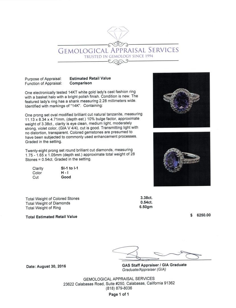 One electronically tested 14KT white gold lady's cast fashion ring with a basket halo with a bright polish finish. The featured lady's ring has a shank measuring 2.28 millimeters wide. Identified with markings of '14K'. Condition is new. Containing: One prong set oval modified brilliant cut natural tanzanite, measuring 11.13 x 8.34 x 4.71mm, (depth est.) 10%. bulge factor, approximate weight of 3.38ct., clarity is eye clean, medium light, moderately strong, violet color, (GIA V 4/4), cut is good. Transmitting light with no distortion, transparent. Colored gemstones are presumed to have been subjected to commonly used enhancement processes. Graded in the setting. Twenty-Eight prong set round brilliant cut diamonds, measuring 1.75 - 1.65 x 1.05mm (depth est.) approximate total weight of 28 Stones = 0.54ct. Graded in the setting. Clarity SI-1 to I-1. Color: H - I Cut Good. Total Weight of Colored Stones 3.38ct. Total Weight of Diamonds 0.54ct. Total Weight of Ring 6.50gm. GAS Appraised at $6,250.00.